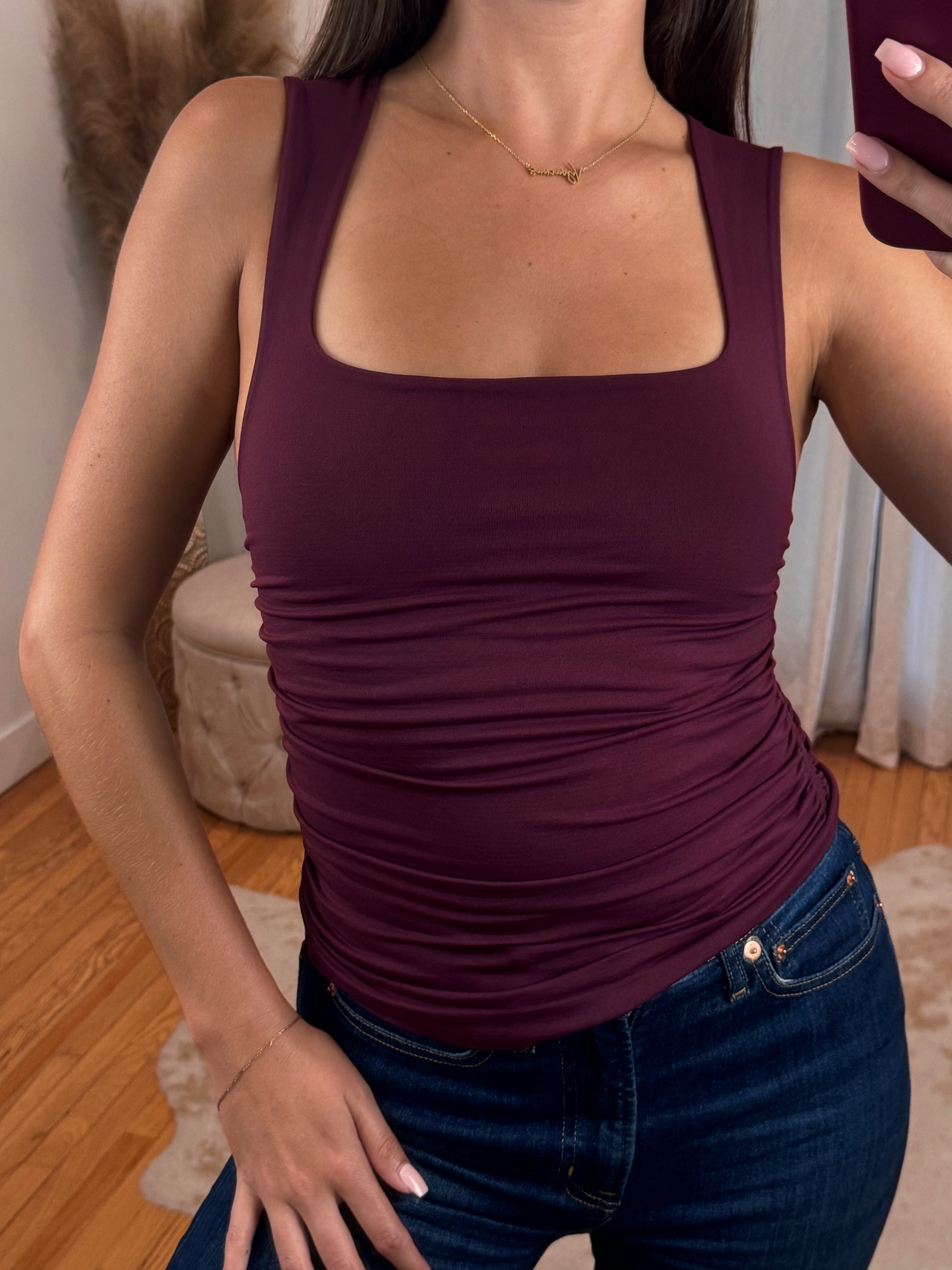 Just like our best-selling Boxy Tank, but full-length + ruching down the side! One size, made in LA, built in shelf bra! Can be dressed up or worn with athleisure!