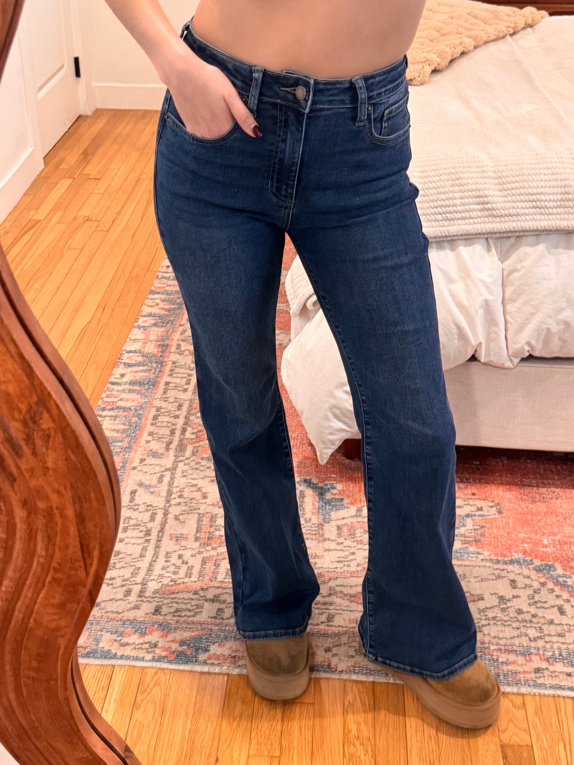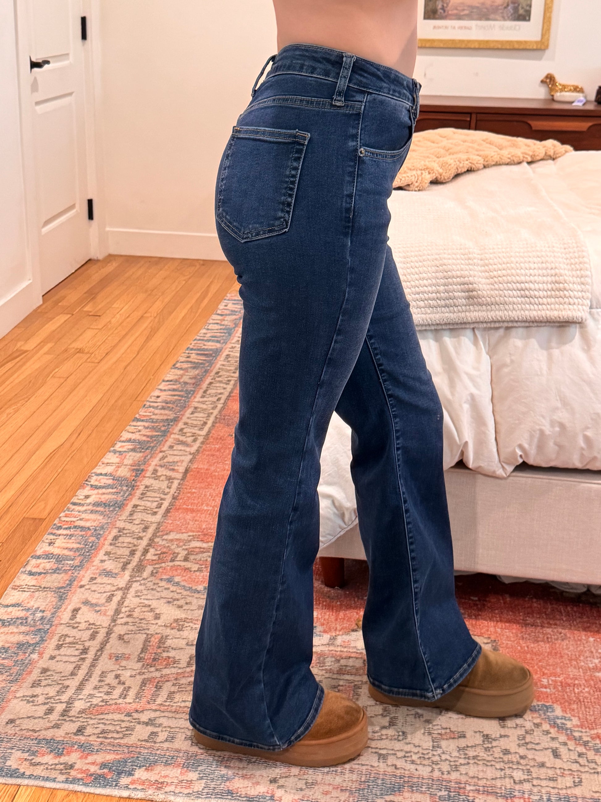 You won't believe how comfy these high waisted, stretchy, dark wash flare jeans are! The perfect amount of stretch that hug your curves!