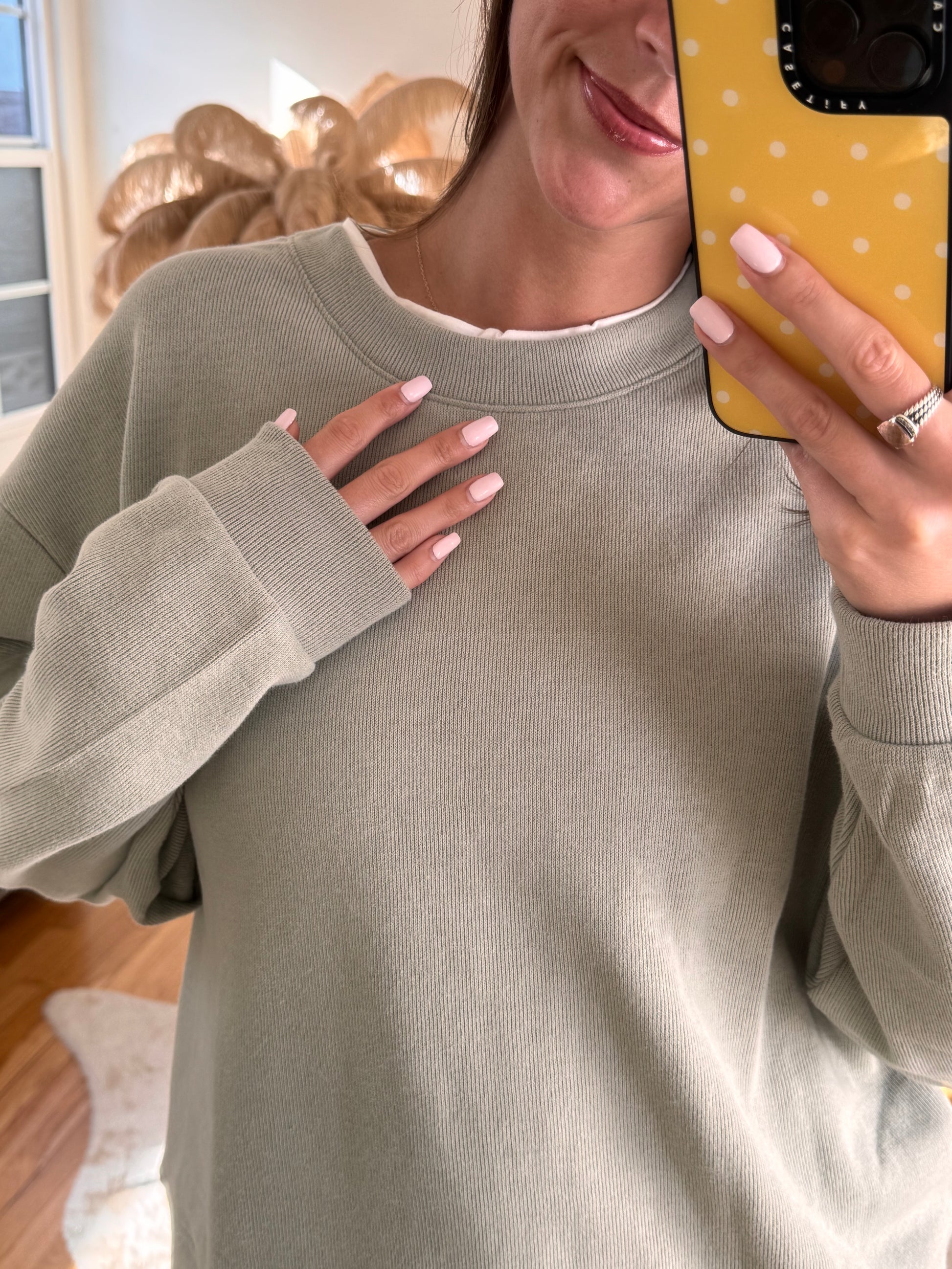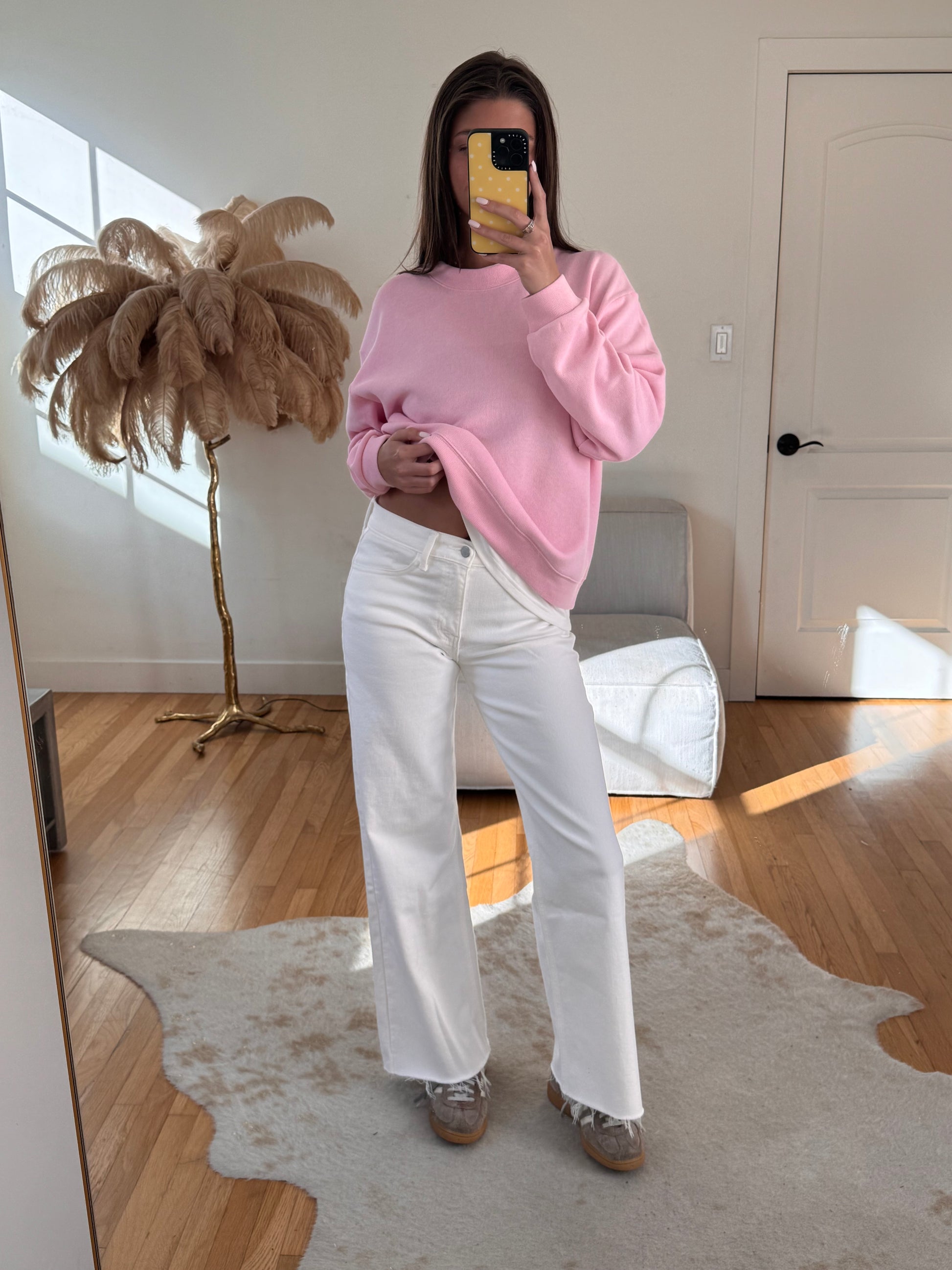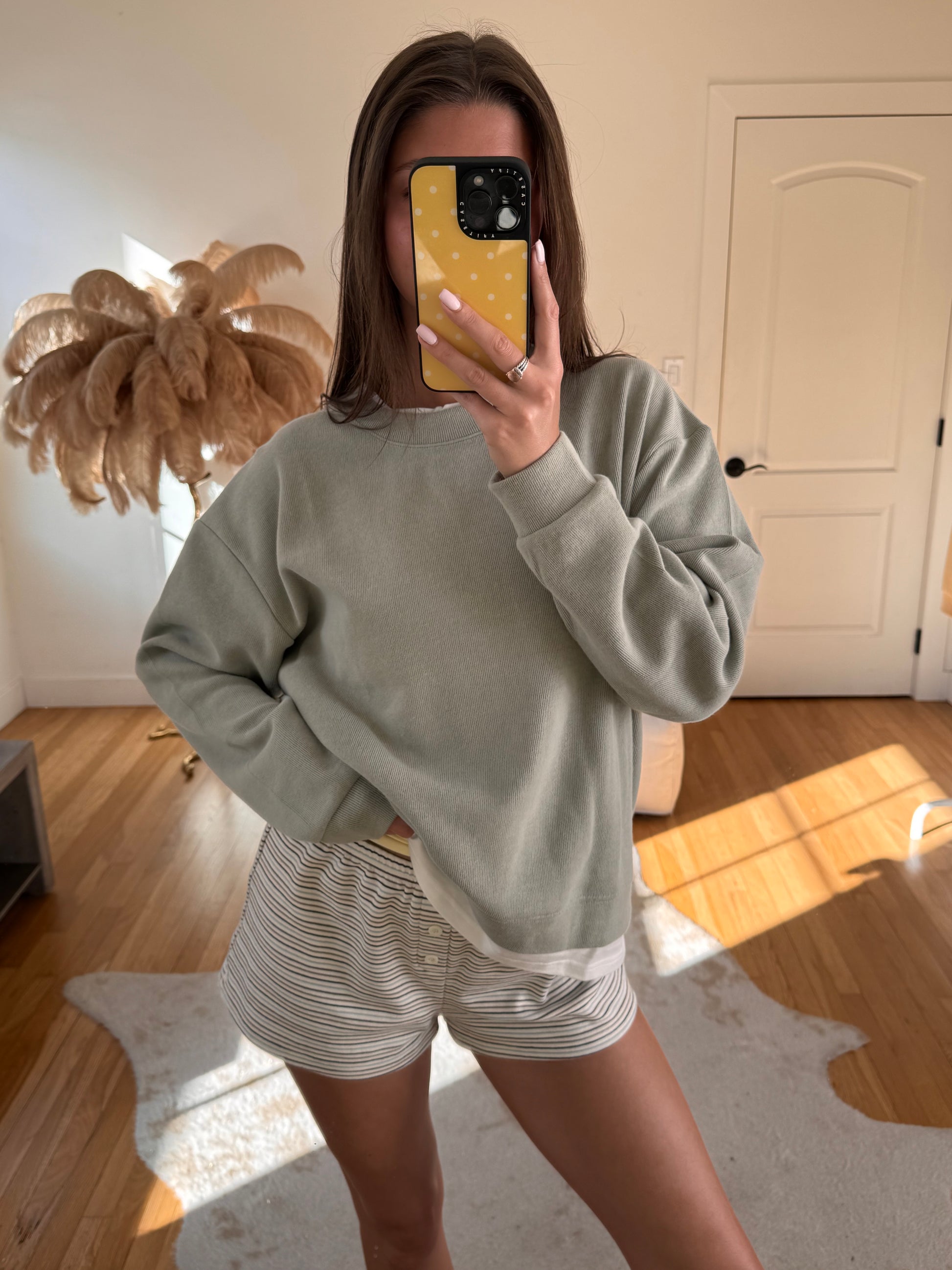 Have everyone thinking you're wearing a white Tee under this micro ribbed cotton crew, when in reality, its all one! Faux layered oversized crewneck perfect for those breezy Spring/Summer days :)