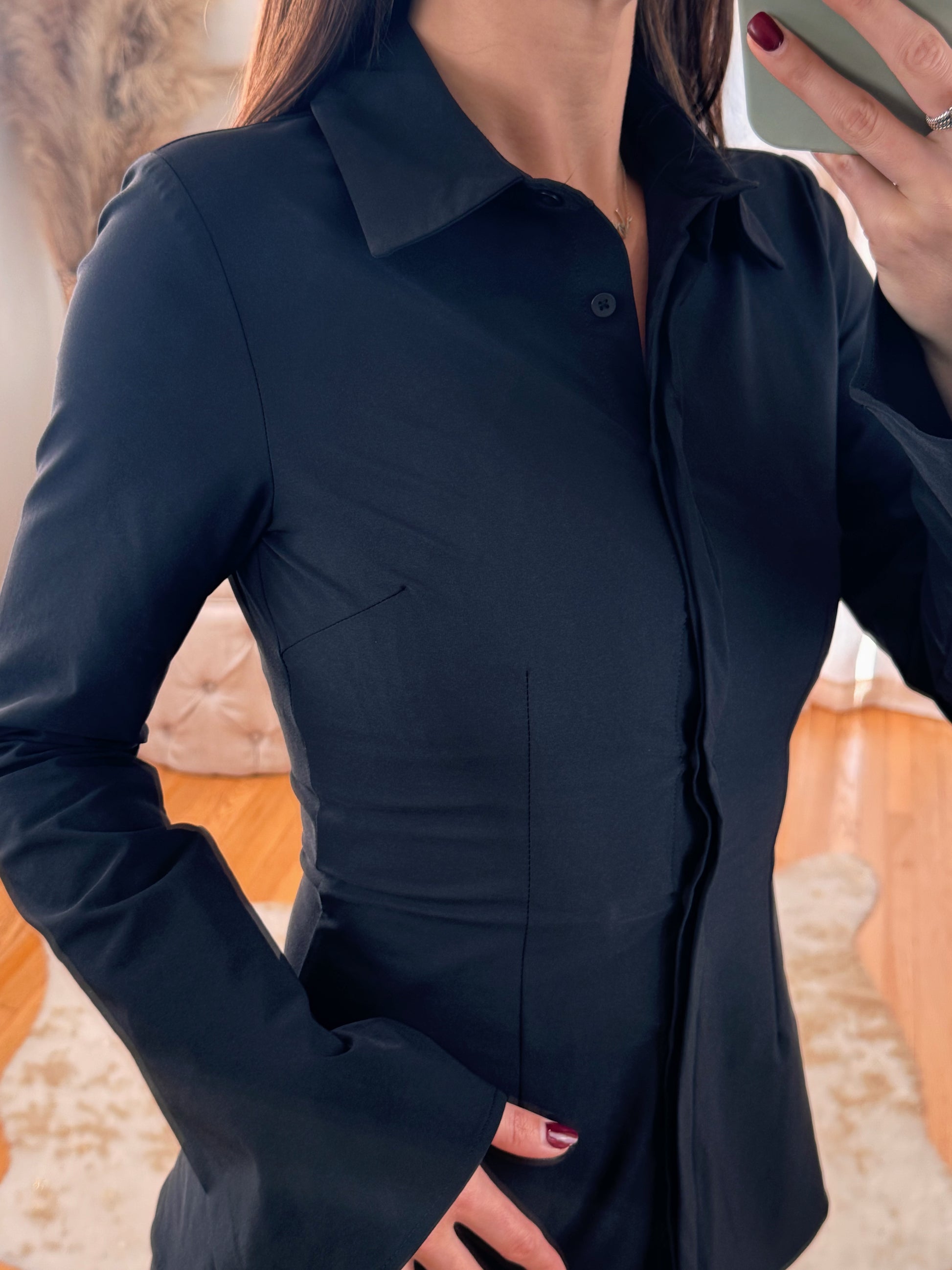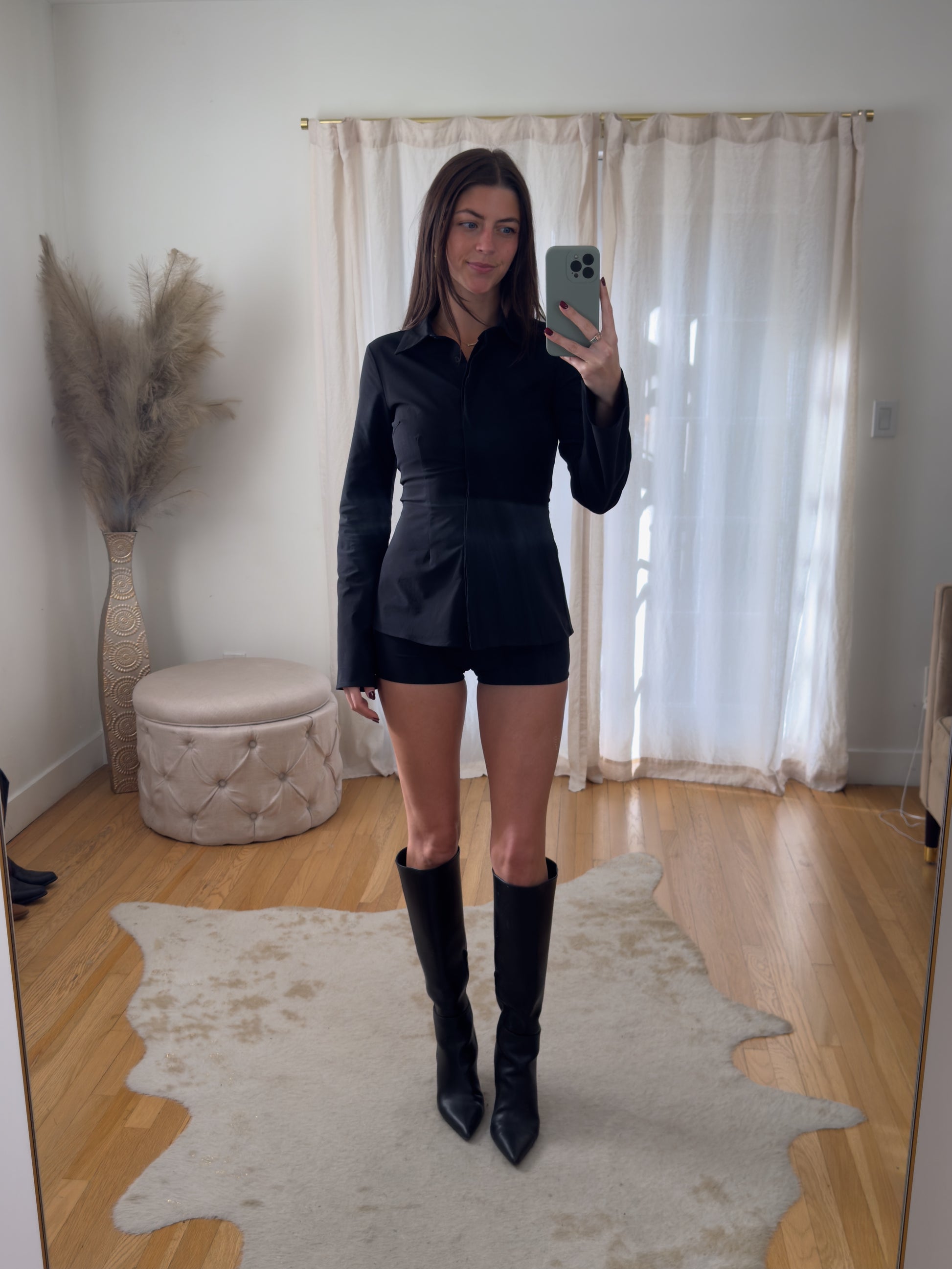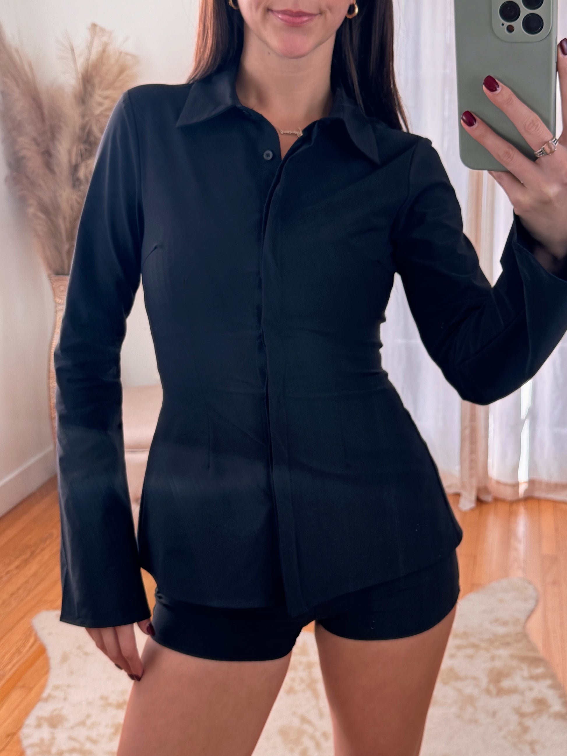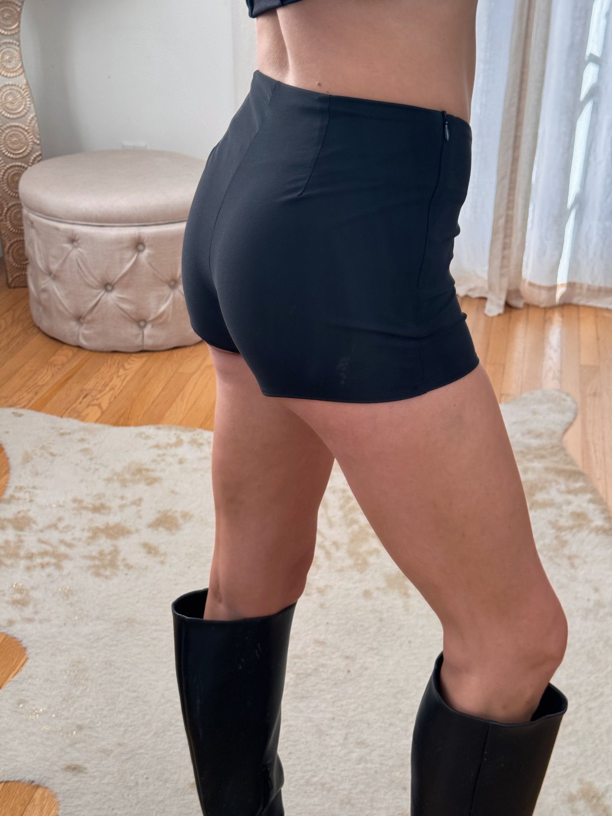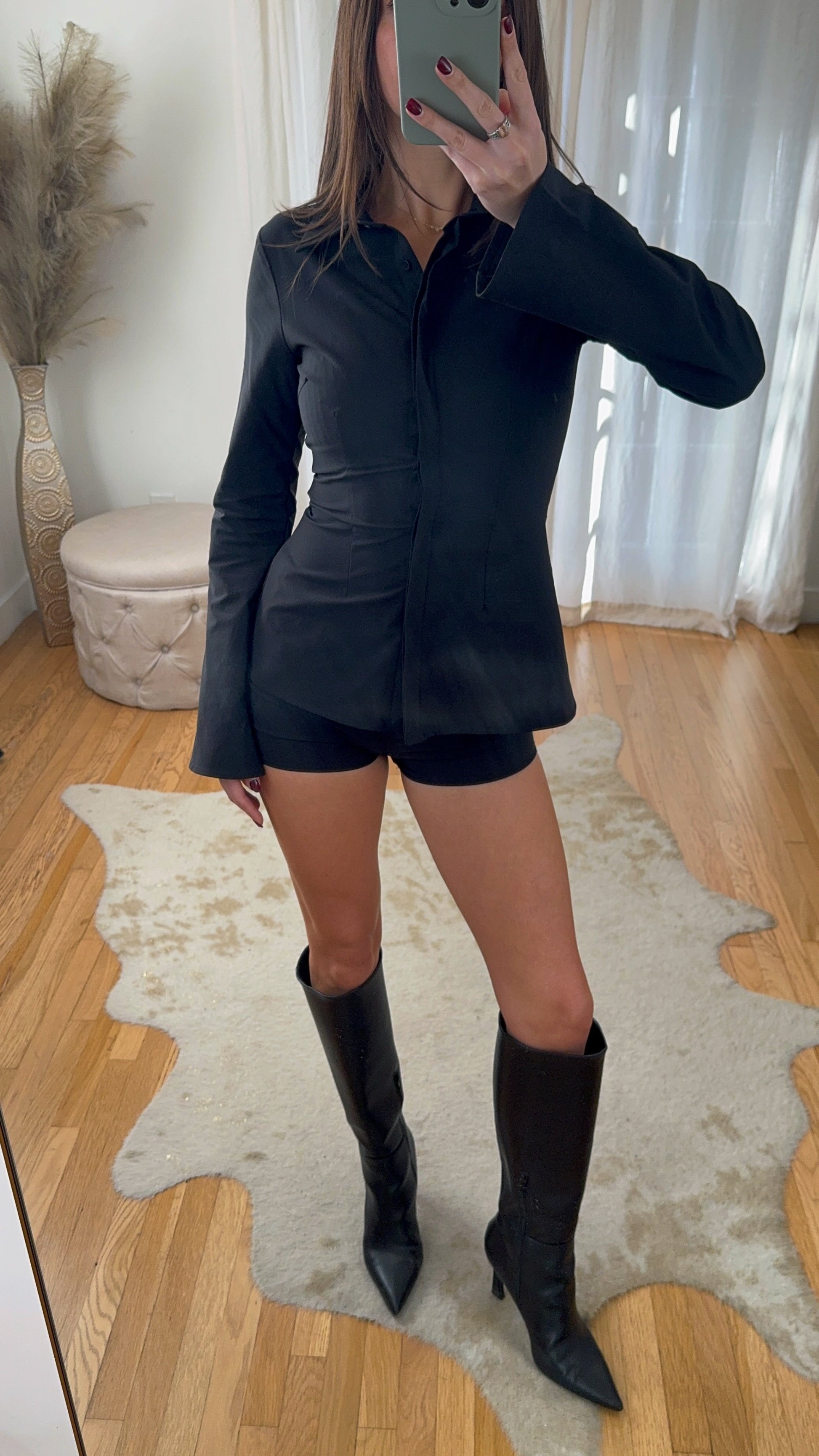 The most flattering black sleek button down top + micro shorts set. Stretchy spandex material. Top is ultra full length and waist area is fitted + has backside slit. Shorts Zip up the side. Sold together
