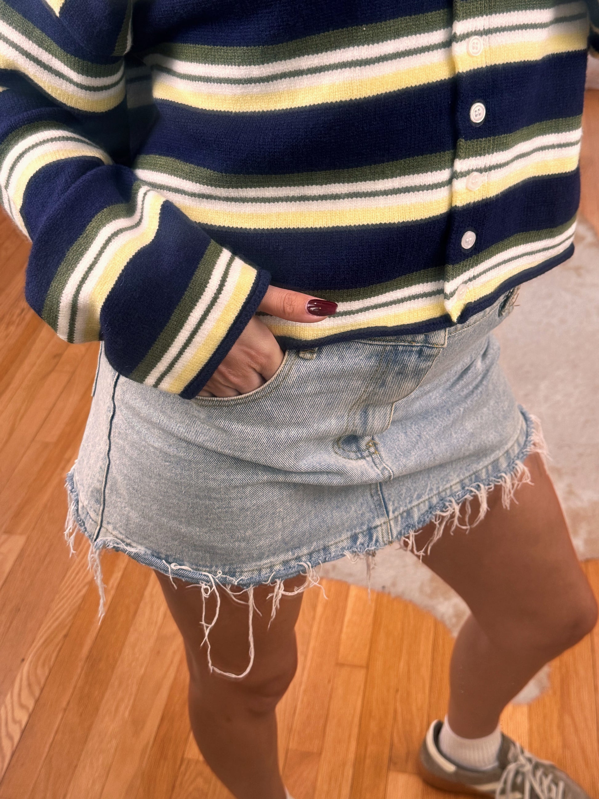 Adorable Navy, Butter Yellow, Olive Green & Ivory Striped Roll Hem Button Up Cardigan. Lightweight and super stretchy. Not itchy at all.