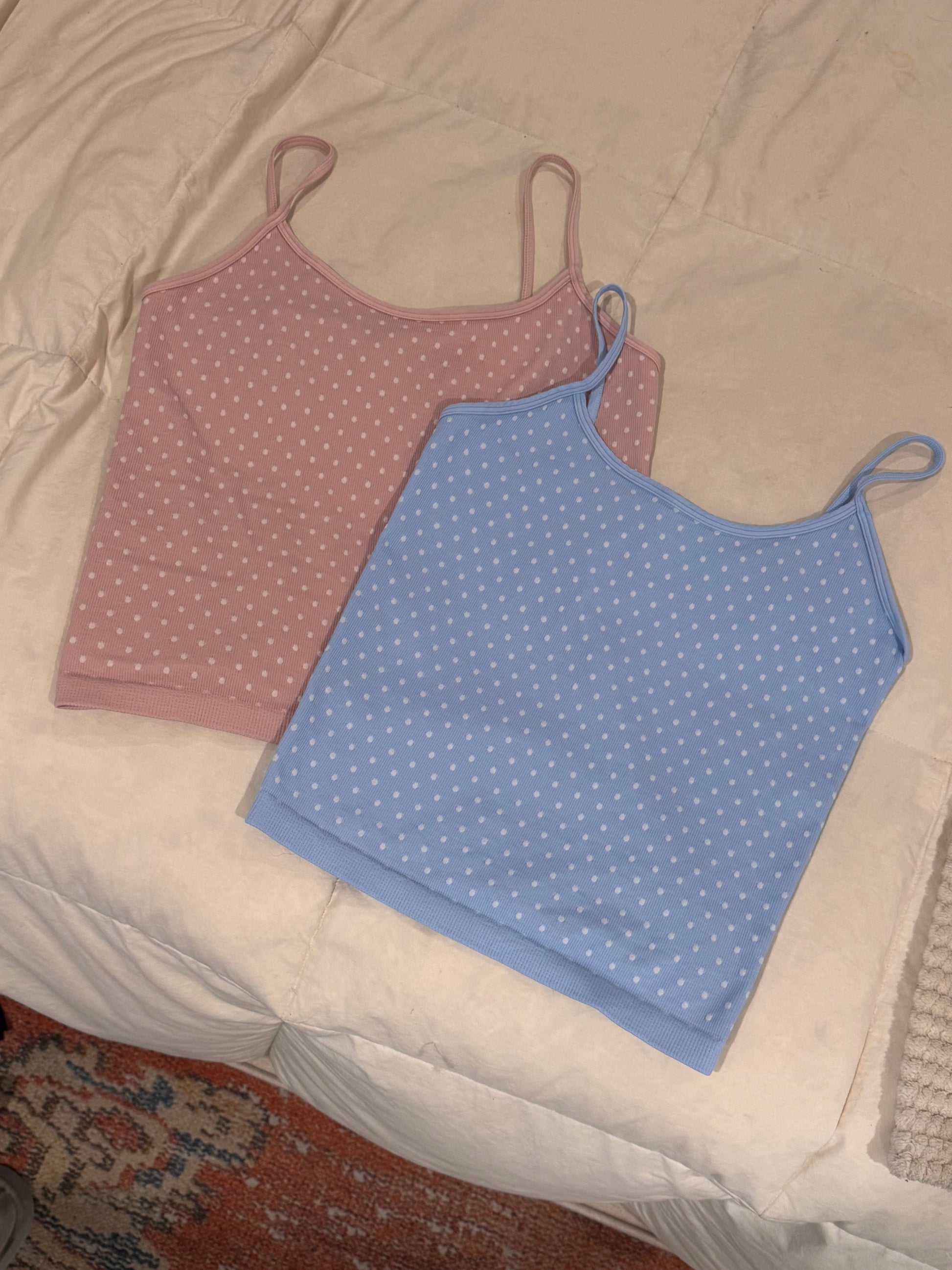 New seamless style! Adorable Mid Length Dainty Polka Dotted Cami Tank Top! No built in shelf bra, but not see through.
