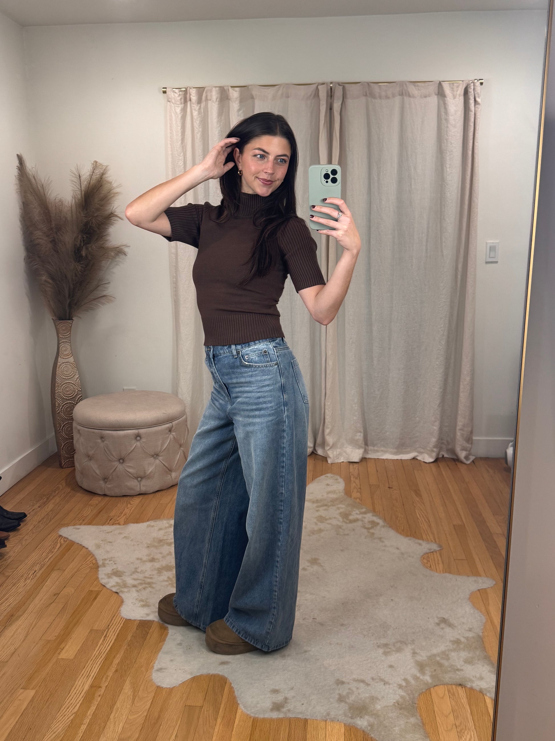Adorable & Classy Short Sleeve Mock Neck Sweater Top ft. Ribbed Sleeves, Collar & Bottom.