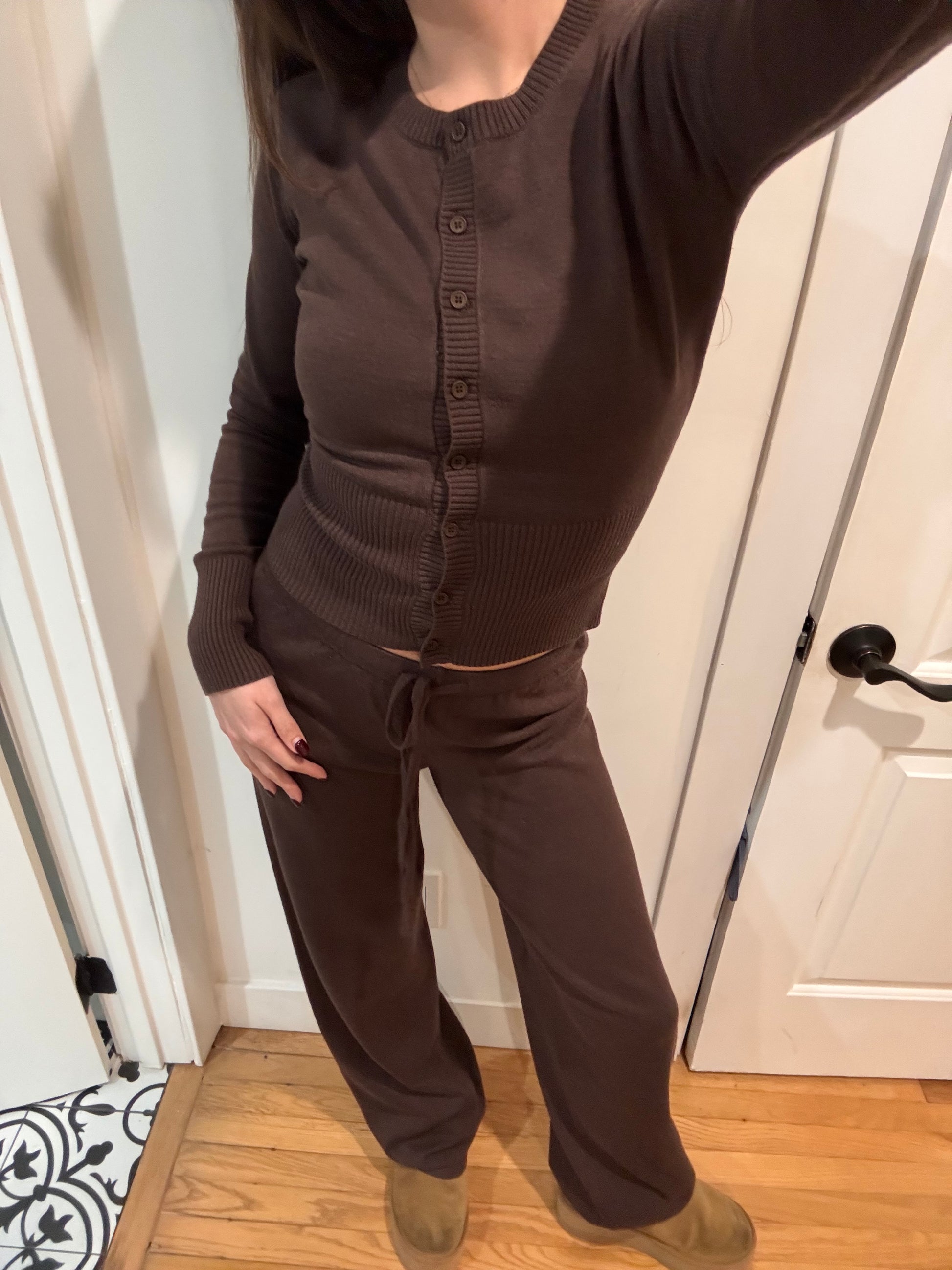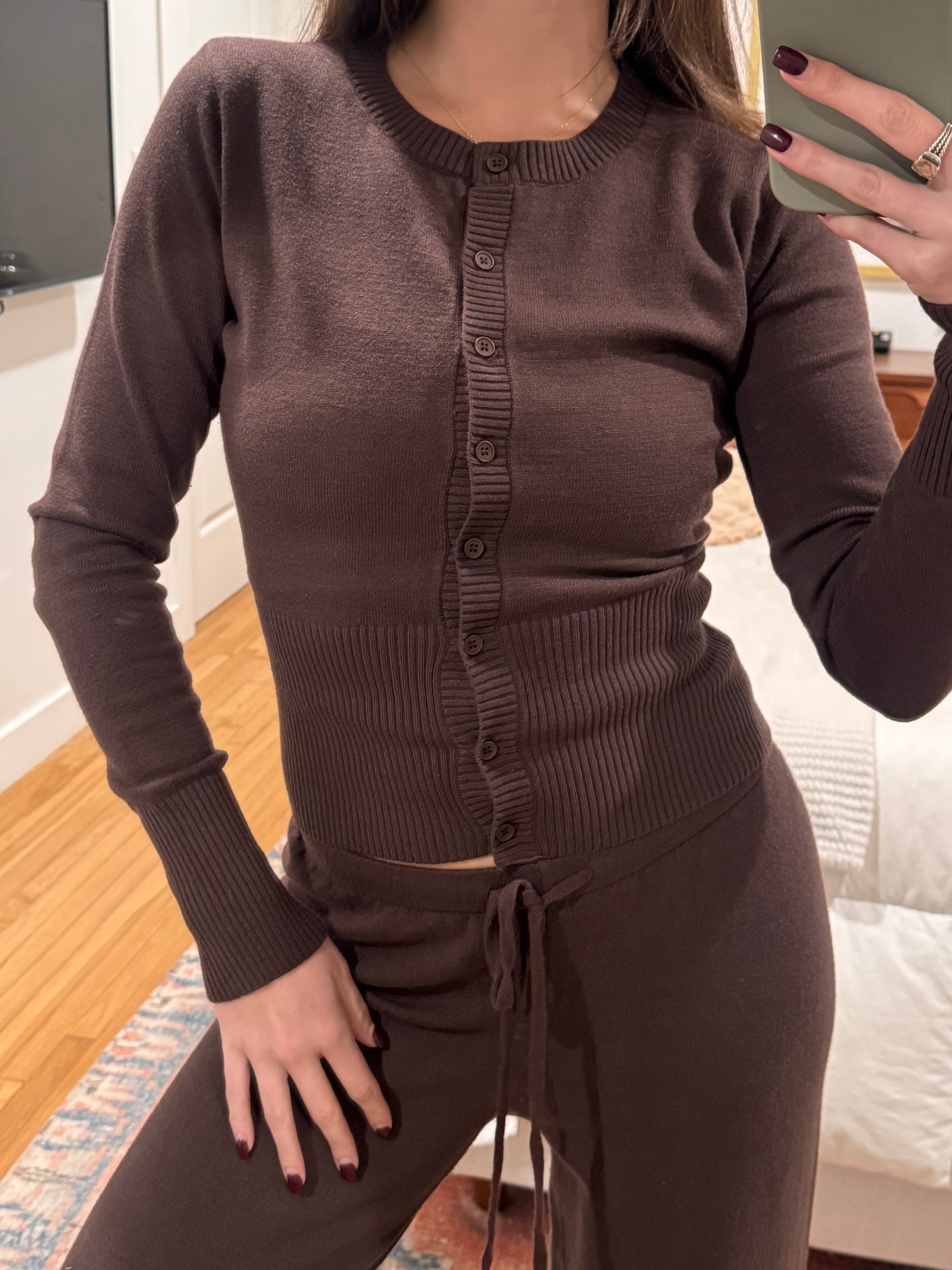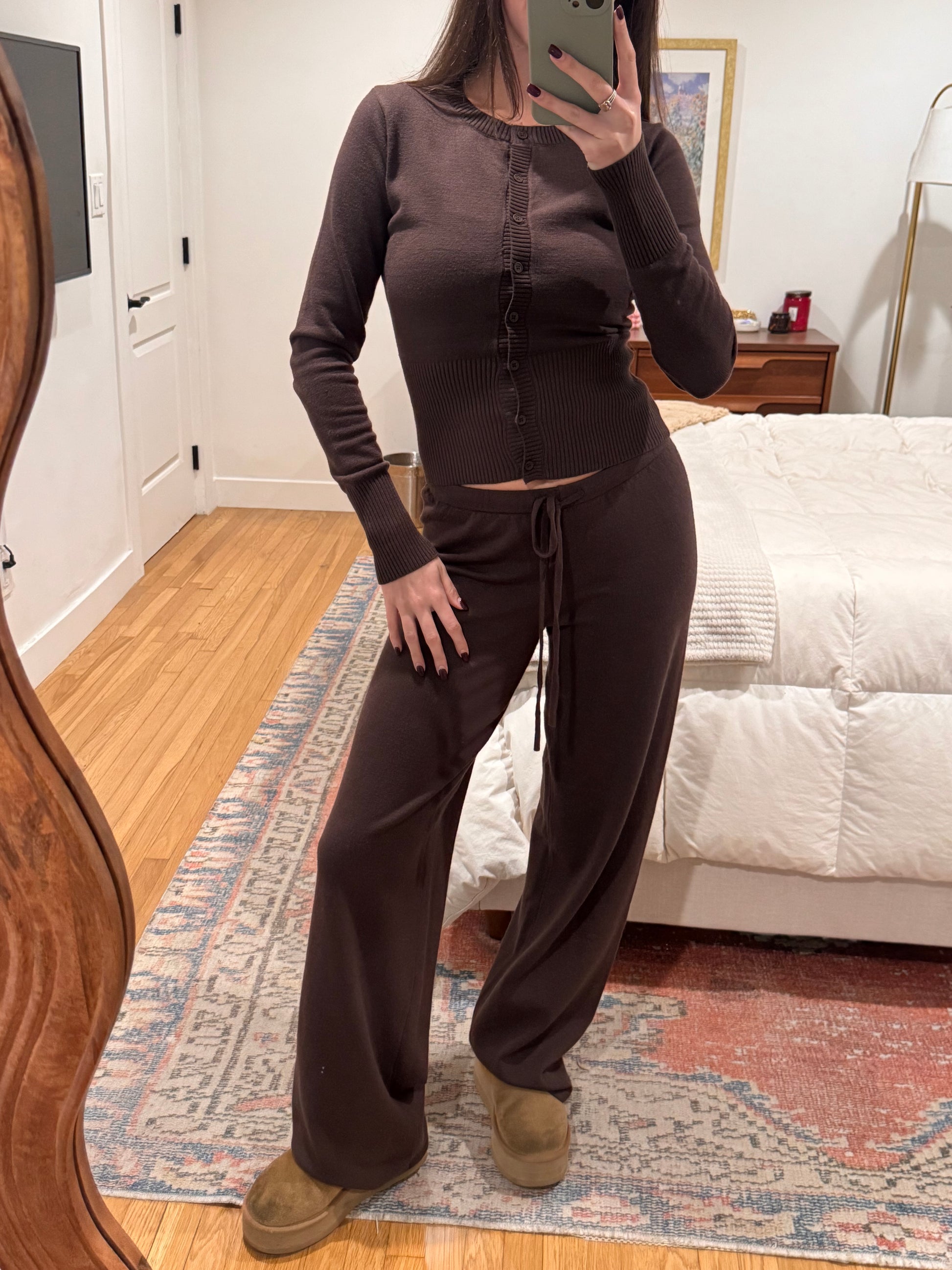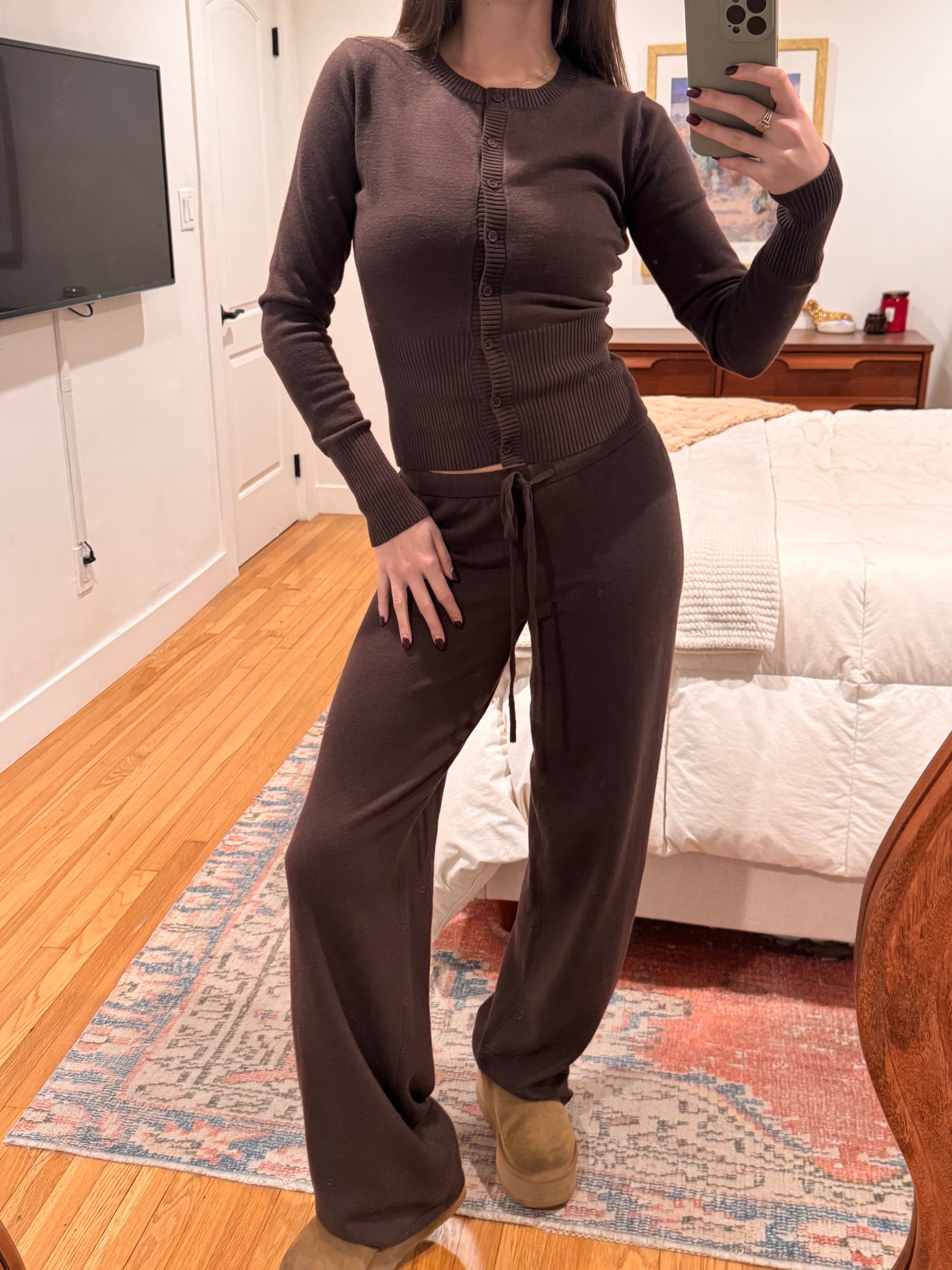 Your new go-to knit lounge set! Fits SO nicely :) Mid Rise Wide Leg Pants ft. Functional Drawstring + Matching Mid Length Cardigan. Sold Together. Not see through.