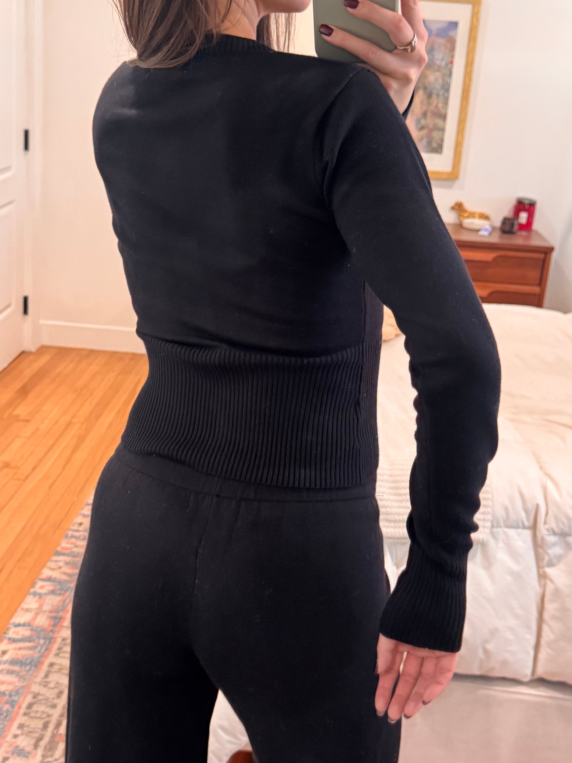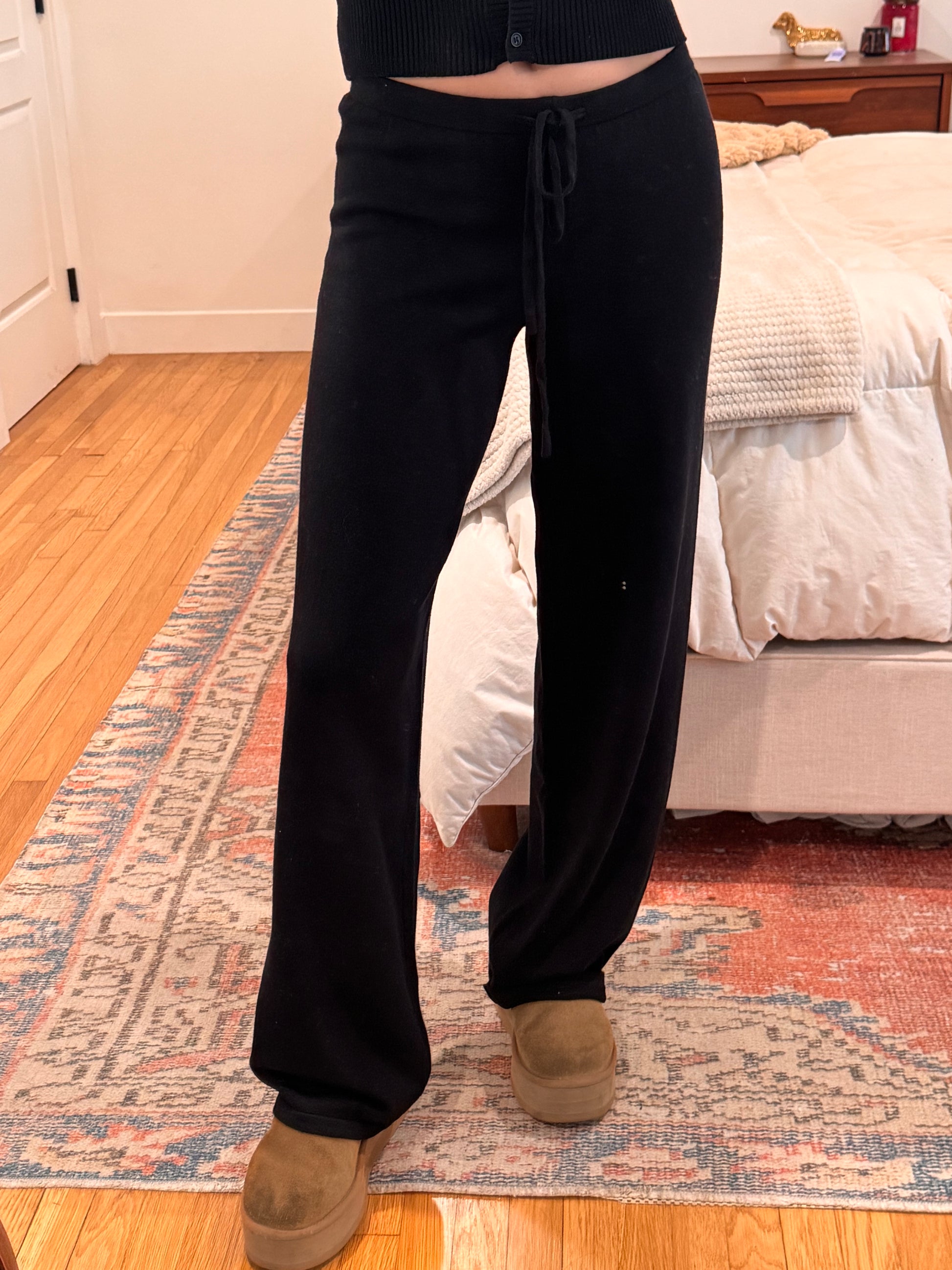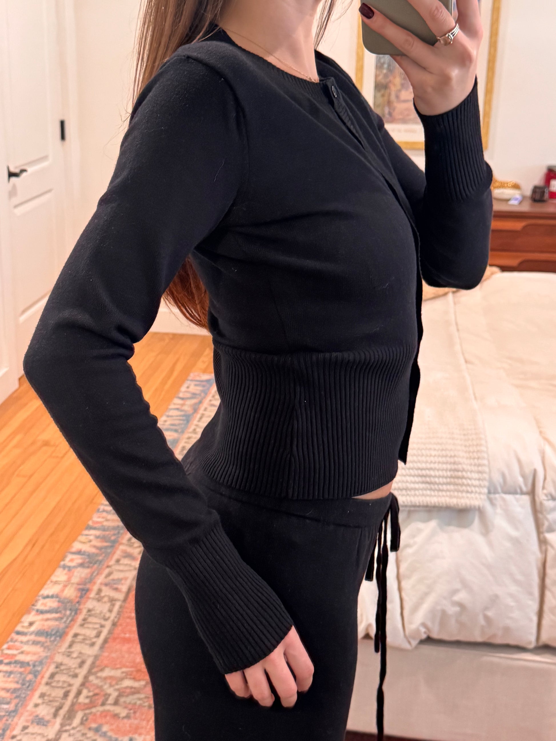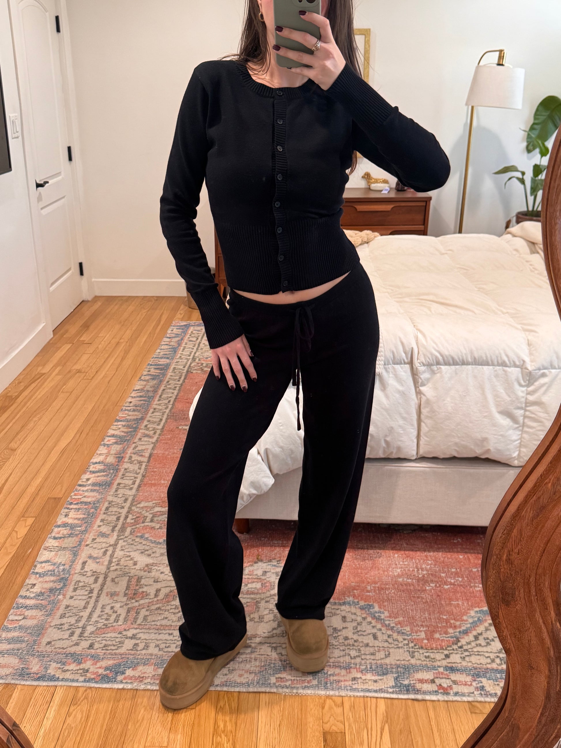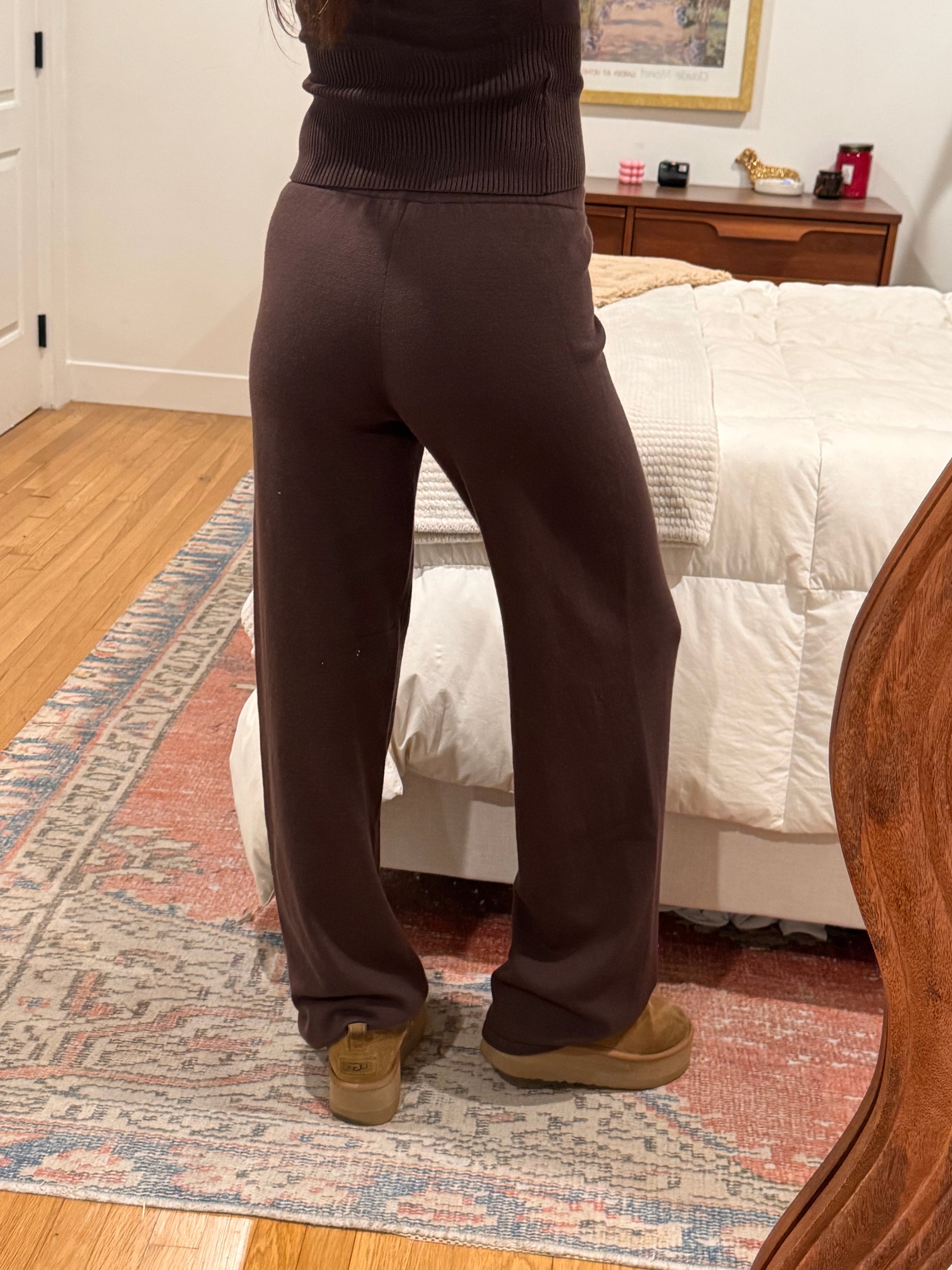Your new go-to knit lounge set! Fits SO nicely :) Mid Rise Wide Leg Pants ft. Functional Drawstring + Matching Mid Length Cardigan. Sold Together. Not see through.