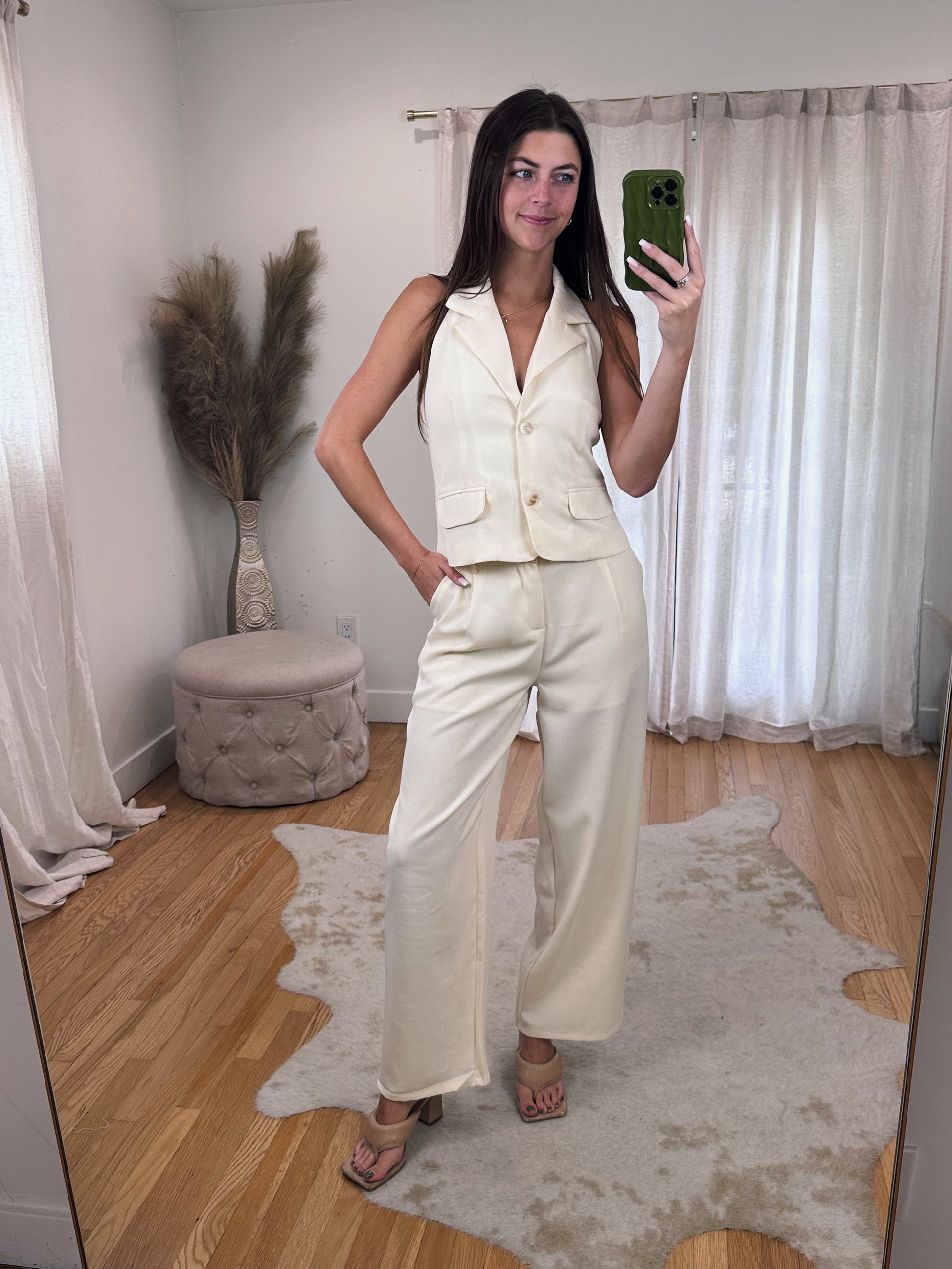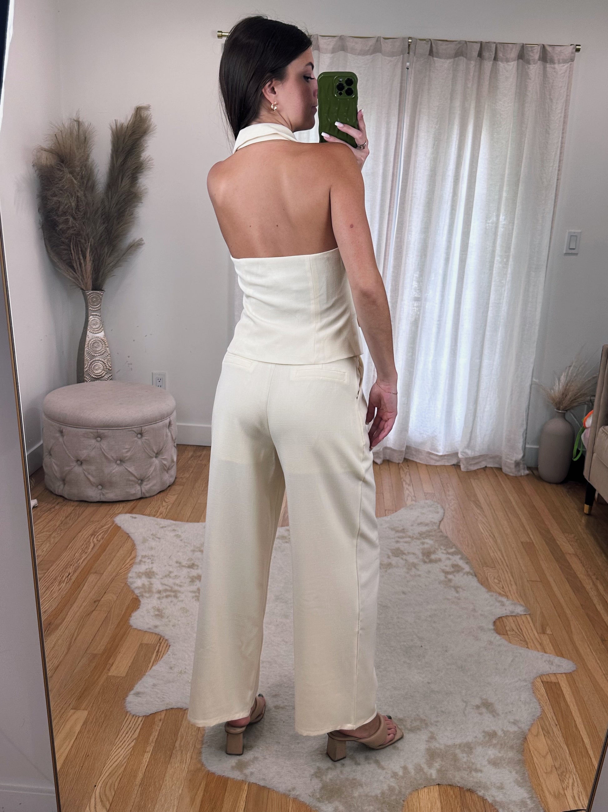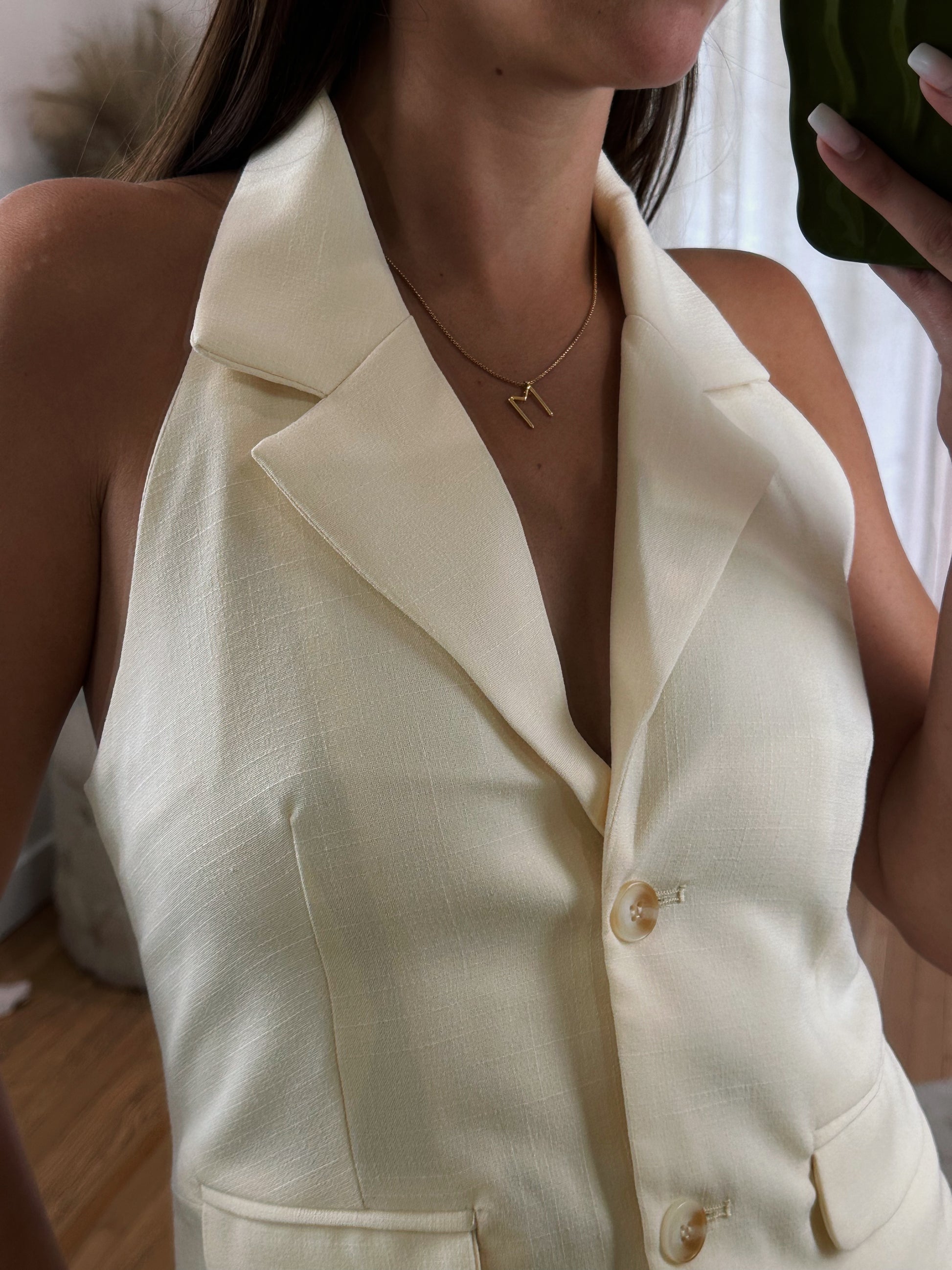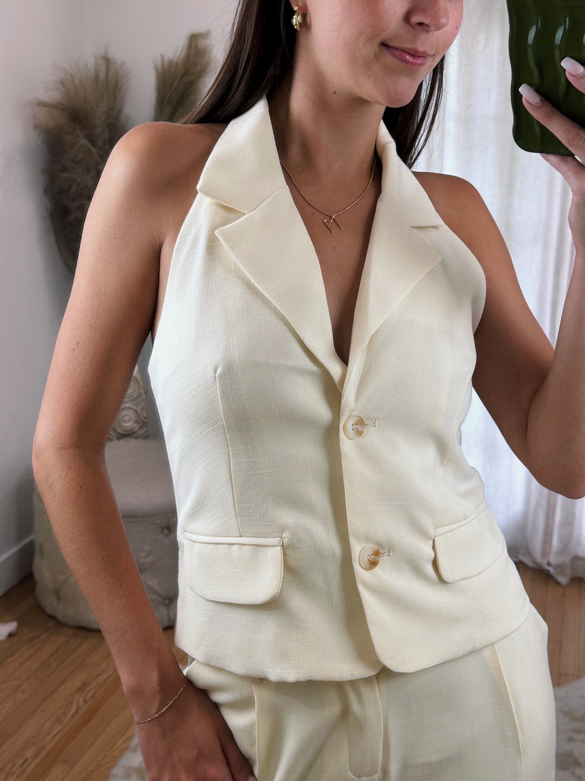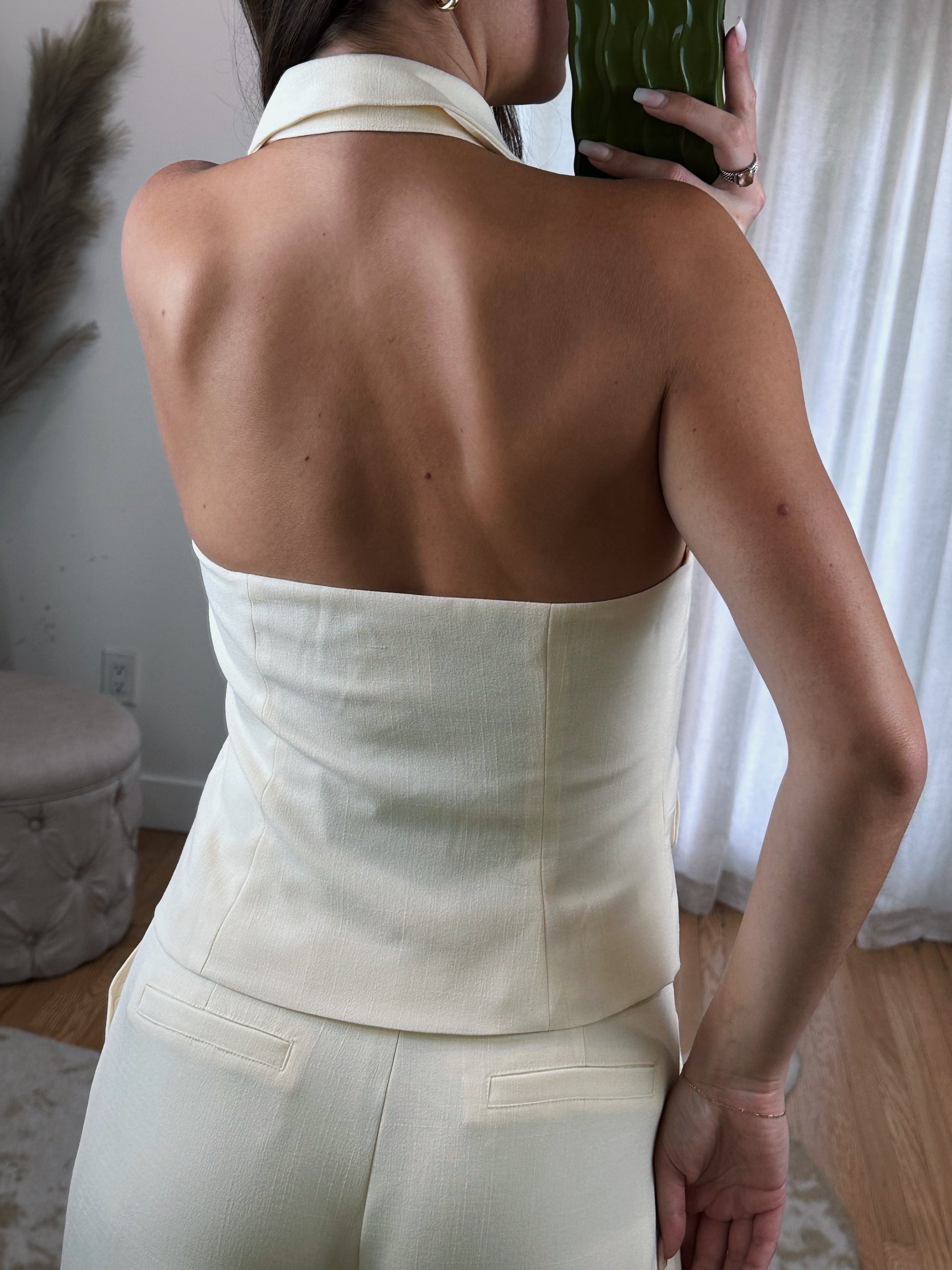 Gorgeous Cream Halter Sleeveless Blazer Top ft. Faux Pockets, Collar & Button Up Closure