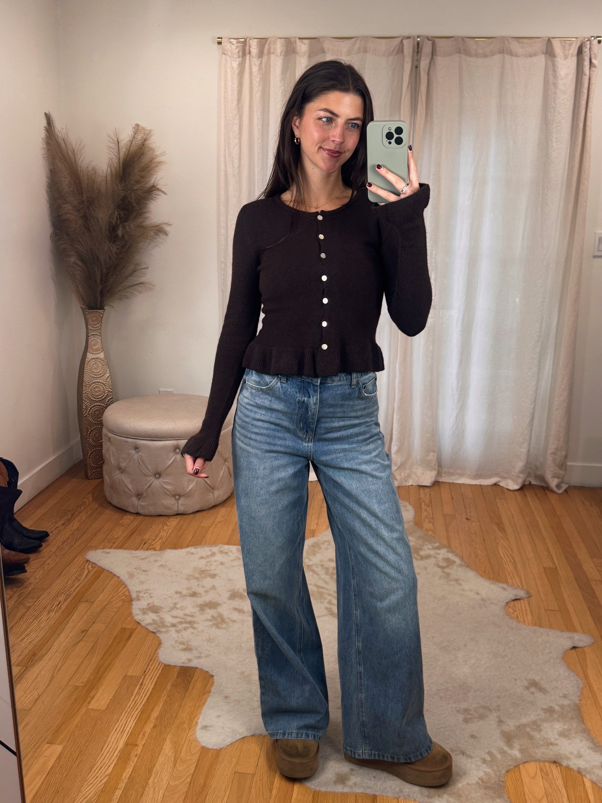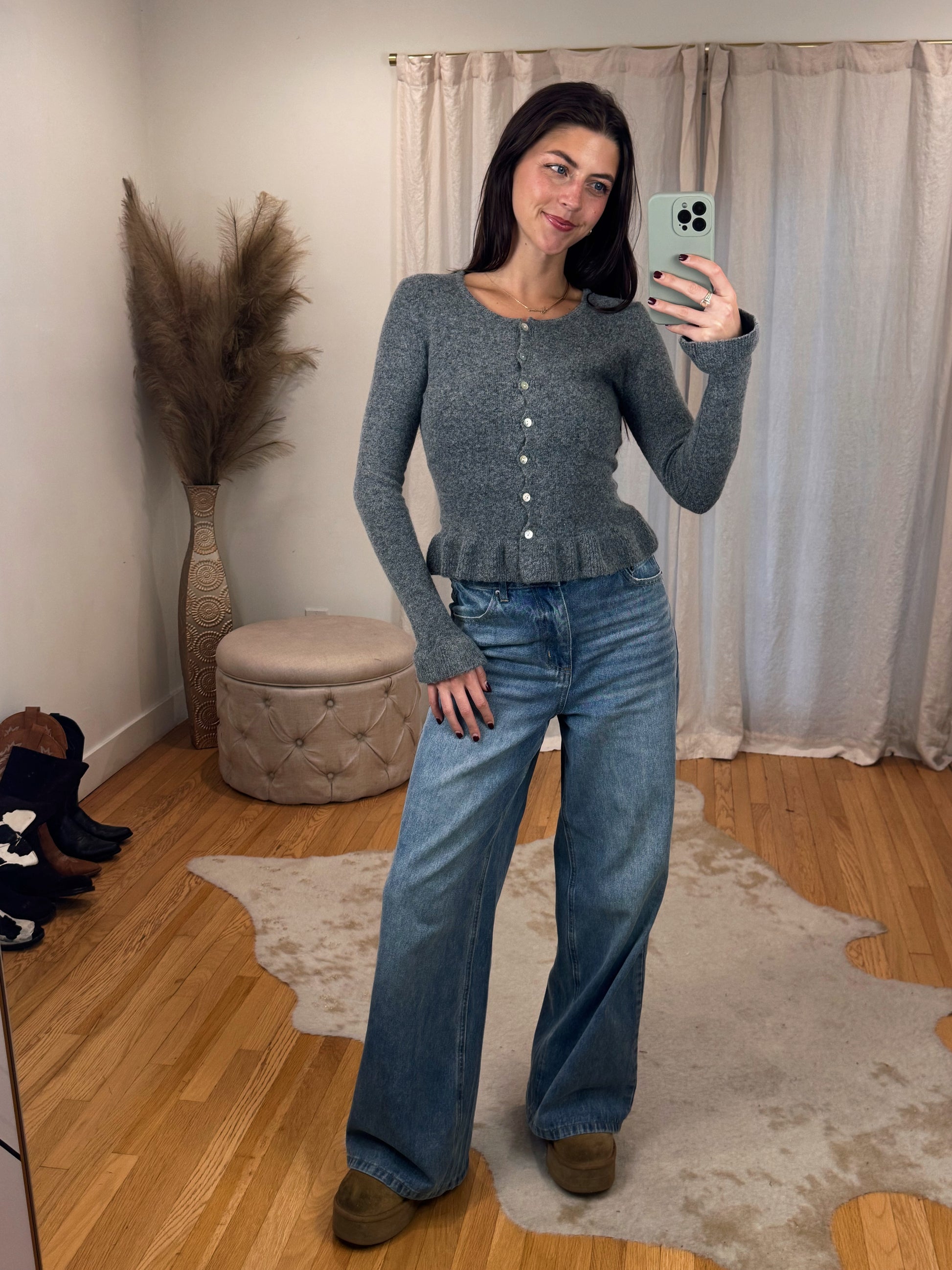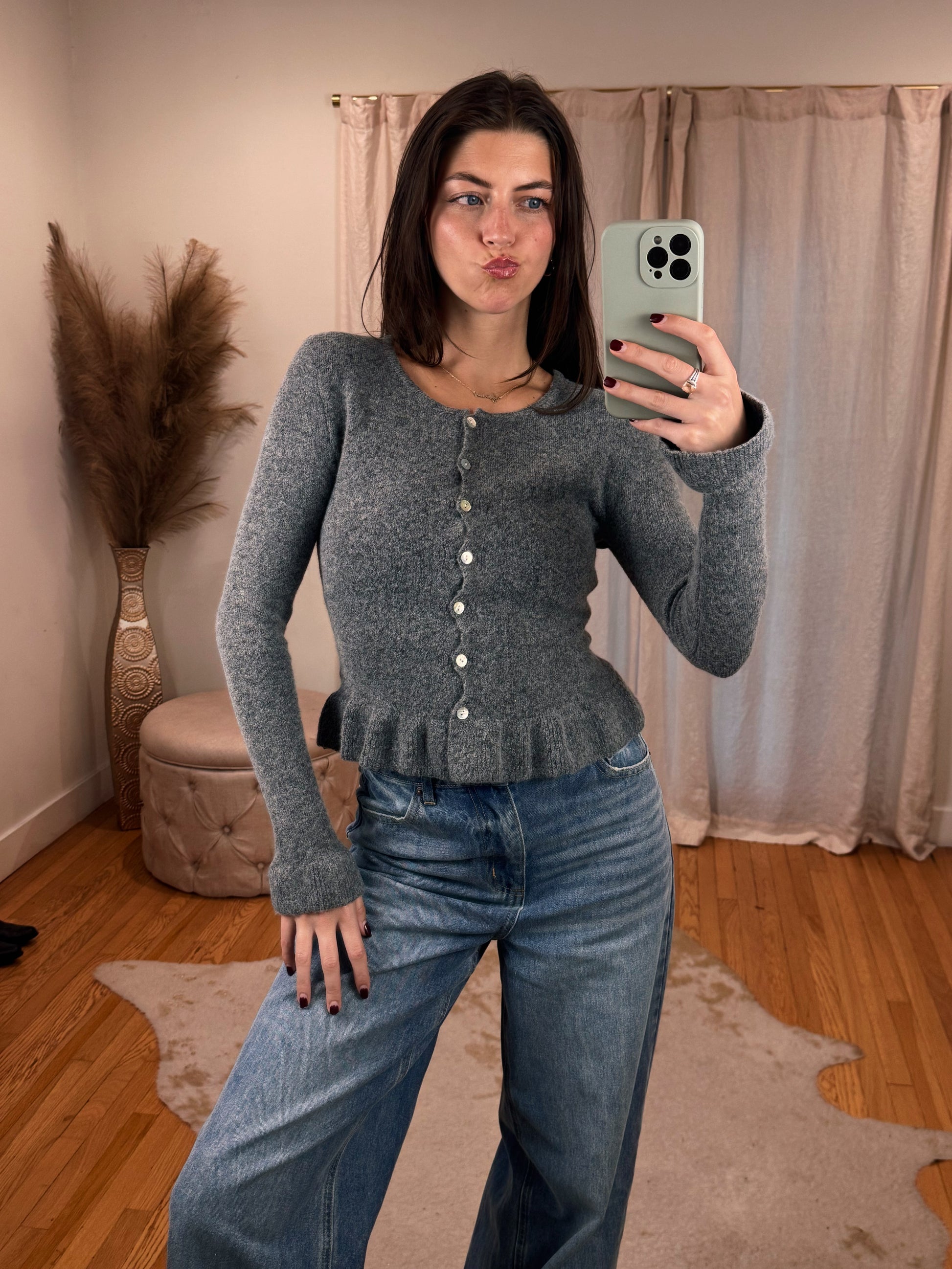 Adorable Button Up Peplum Cut Ruffle Hem Cardigan Sweater. Super soft, lightweight & stretchy! Comes in 3 colors. Cute worn either closed or open! (see photos)