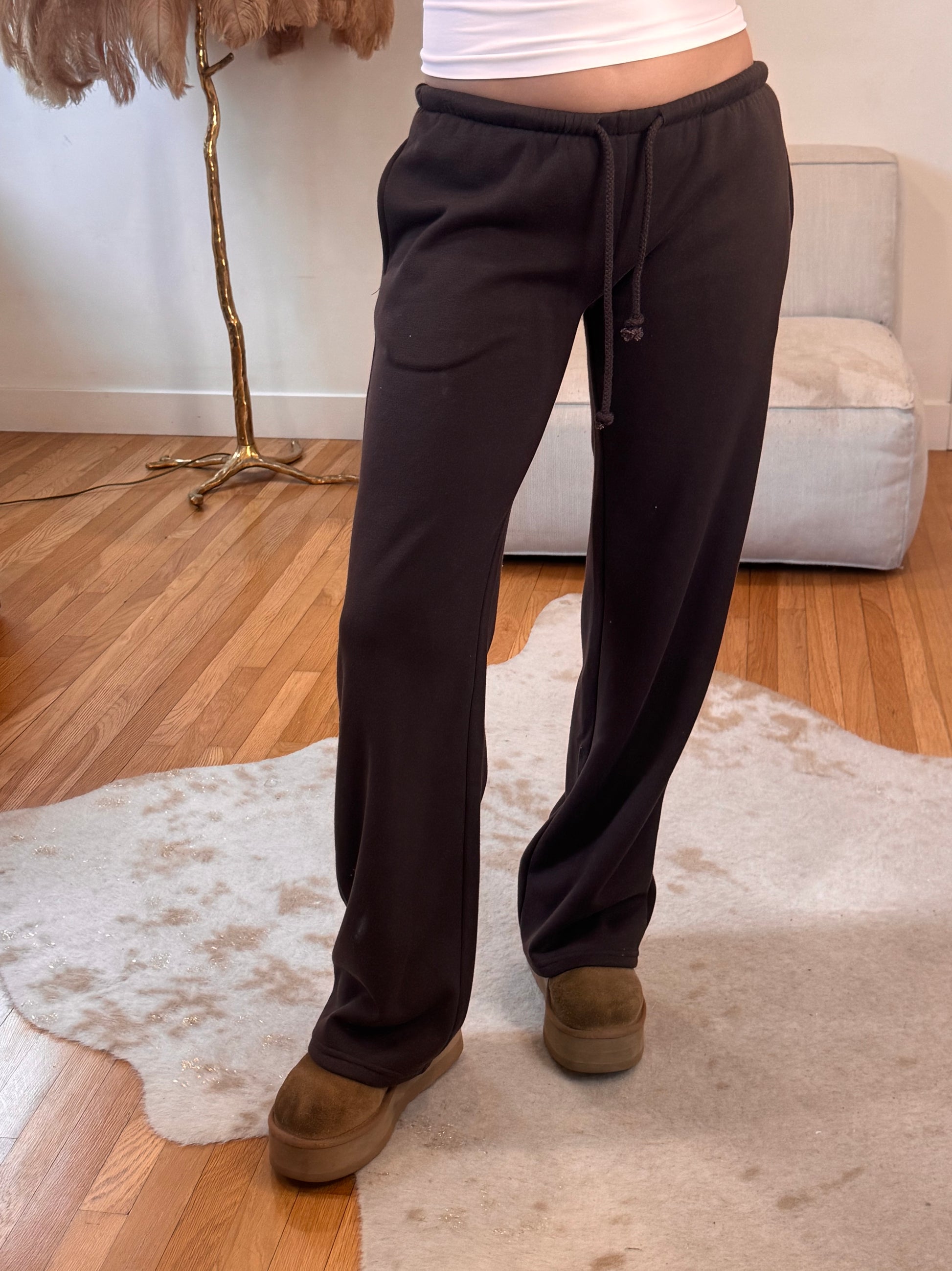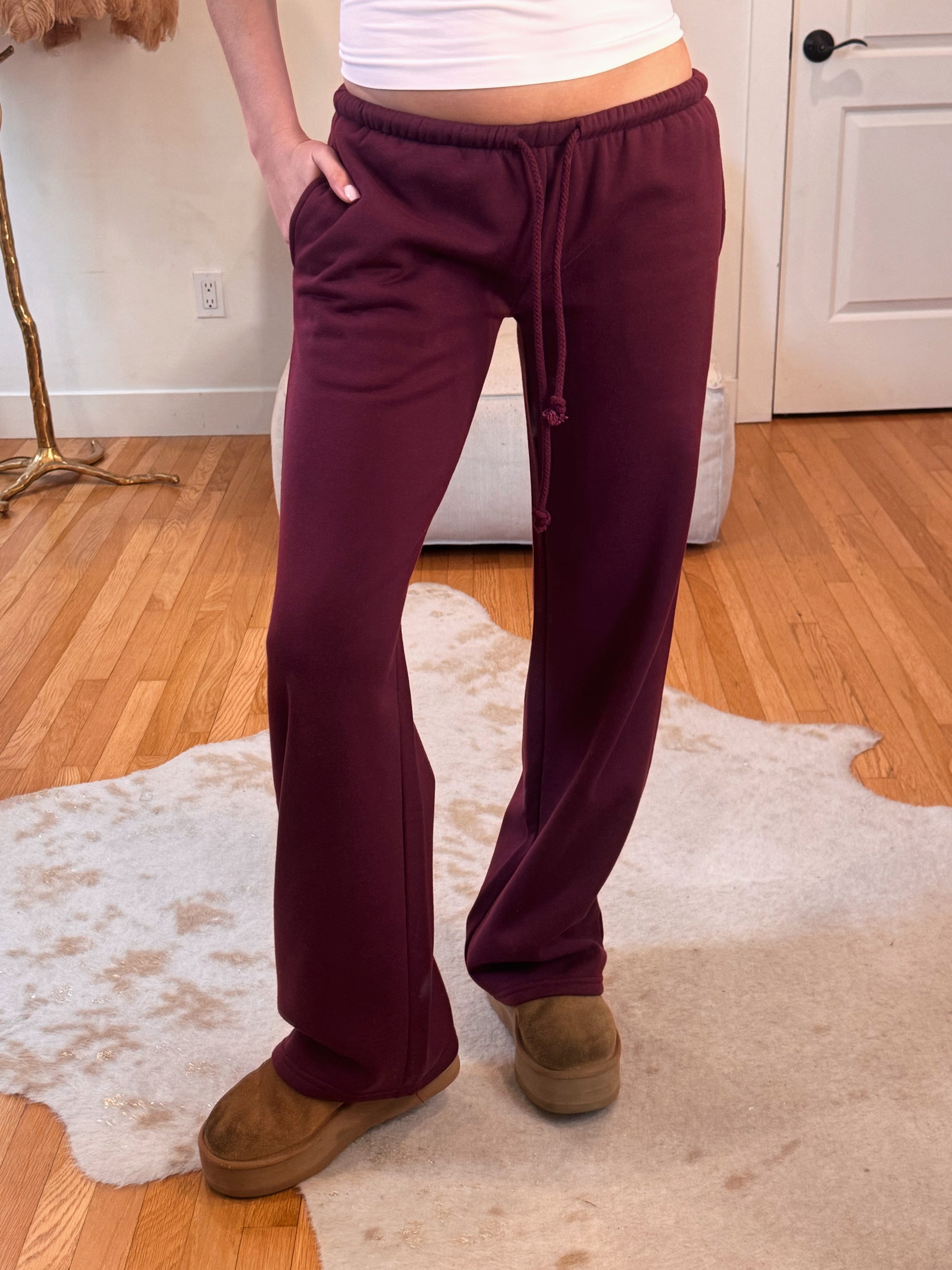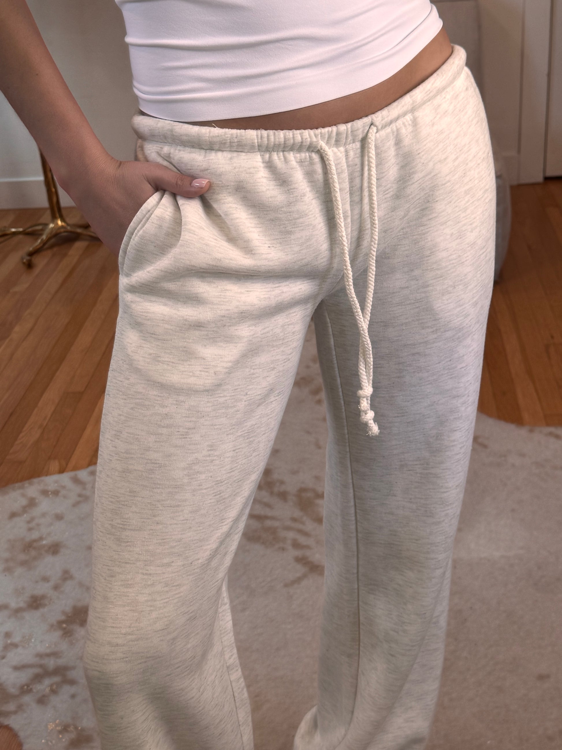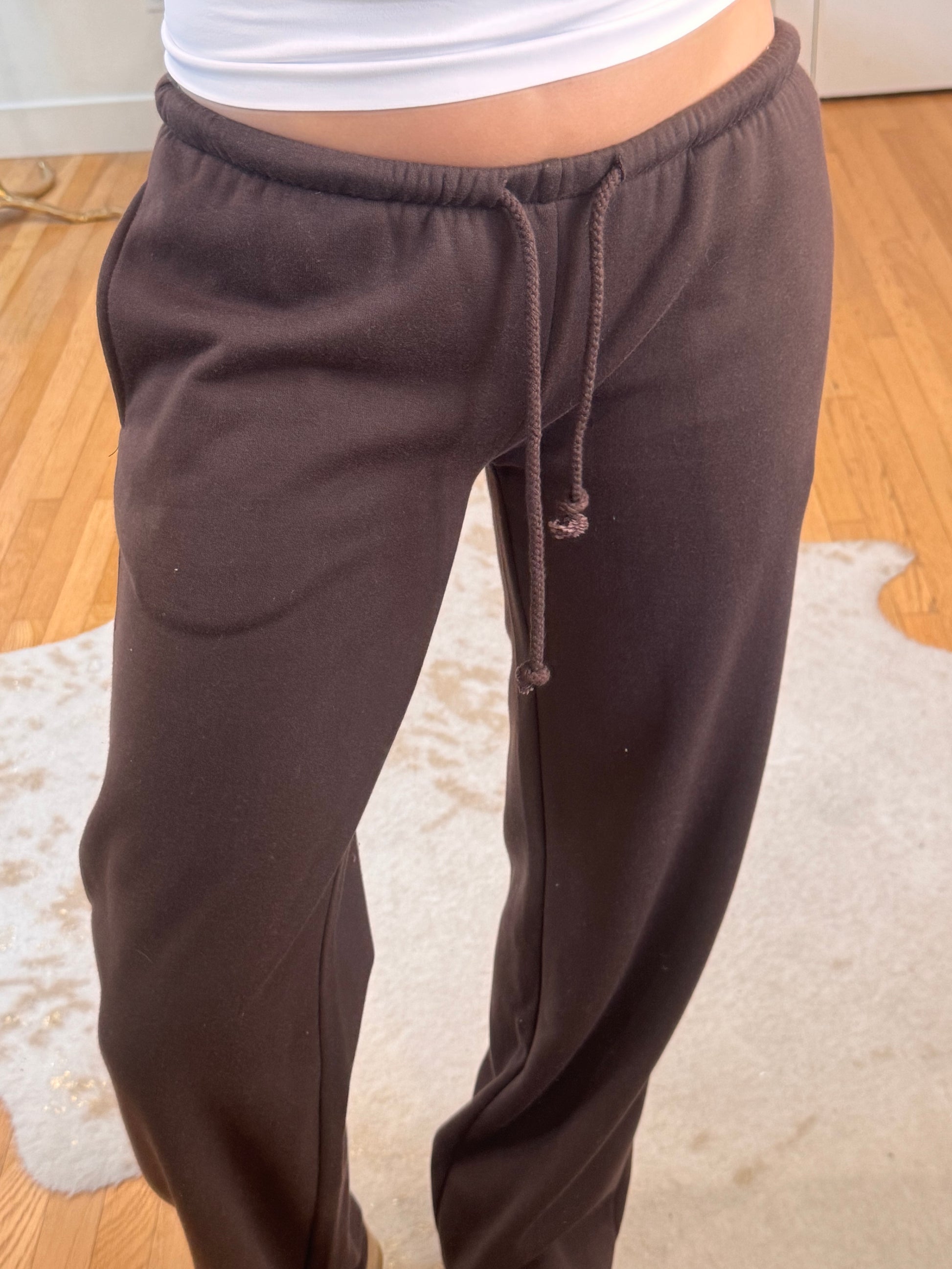 A lightweight alternative to our usual thick and heavy Comfort Collection pieces! Low waisted fleece lined straight leg sweats ft. a drawstring waist & pockets!