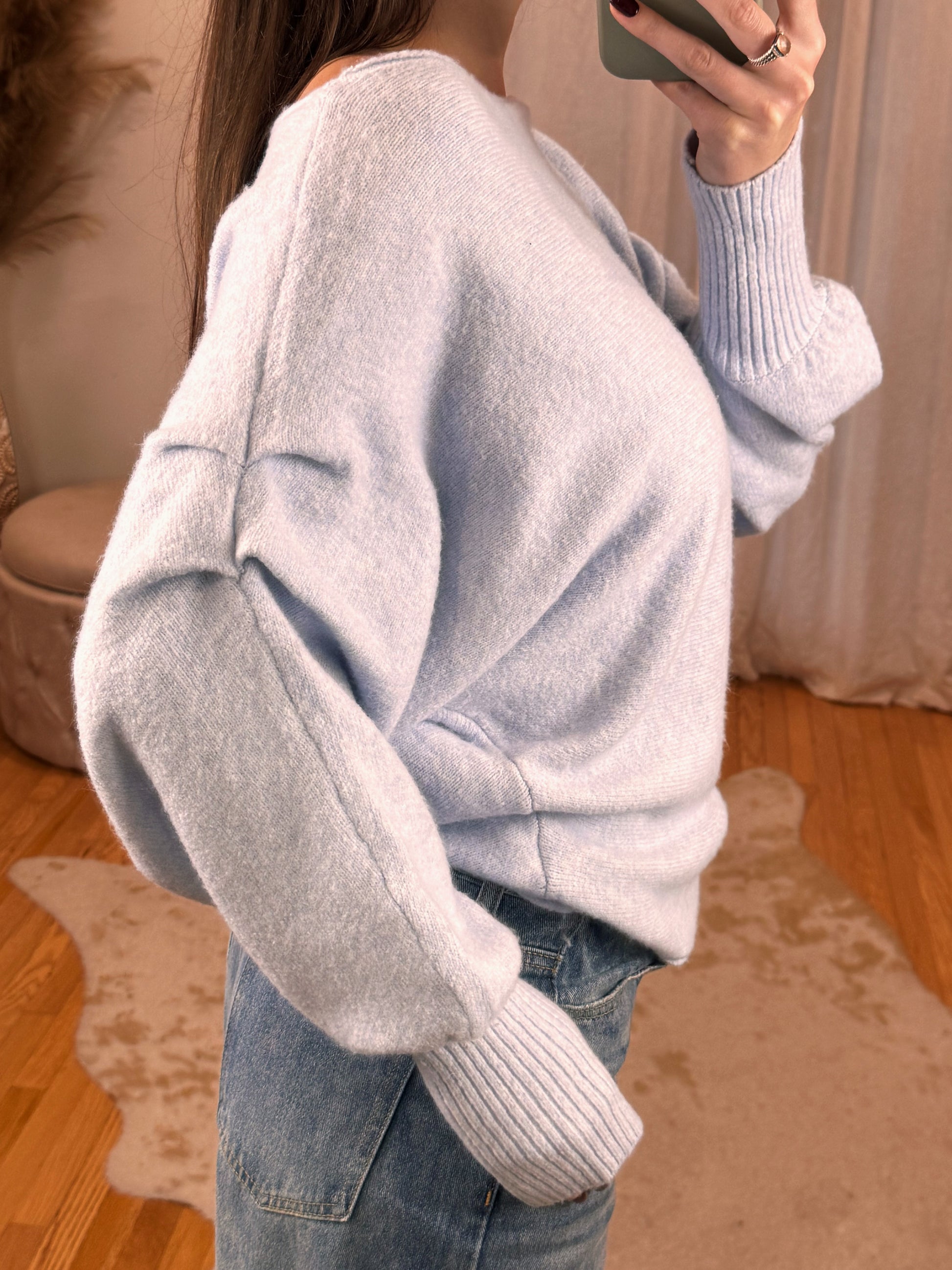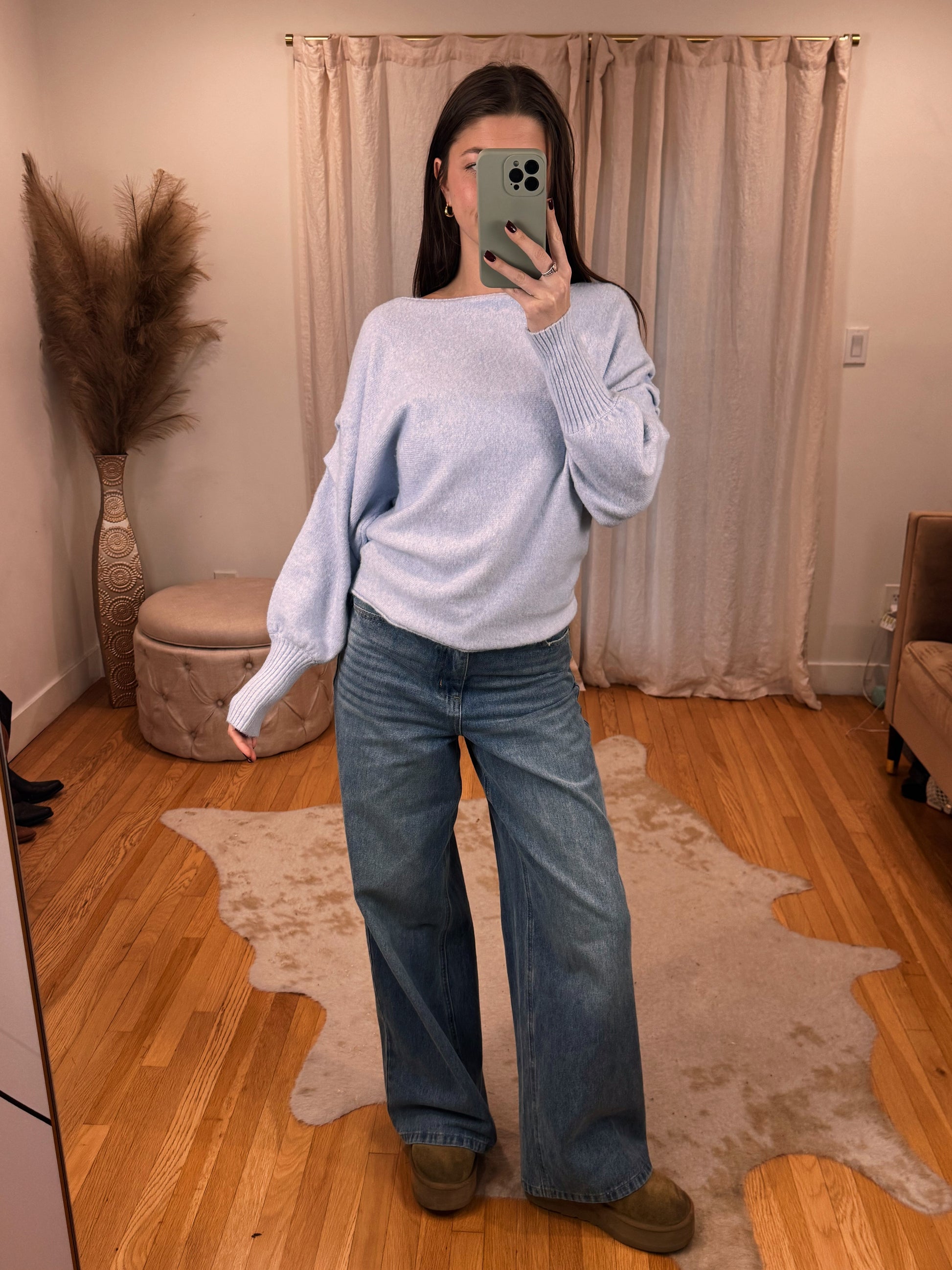 The Softest Icy Blue Boat Neck Sweater ft. Drop Hem Shoulders & Tapered Wrists!