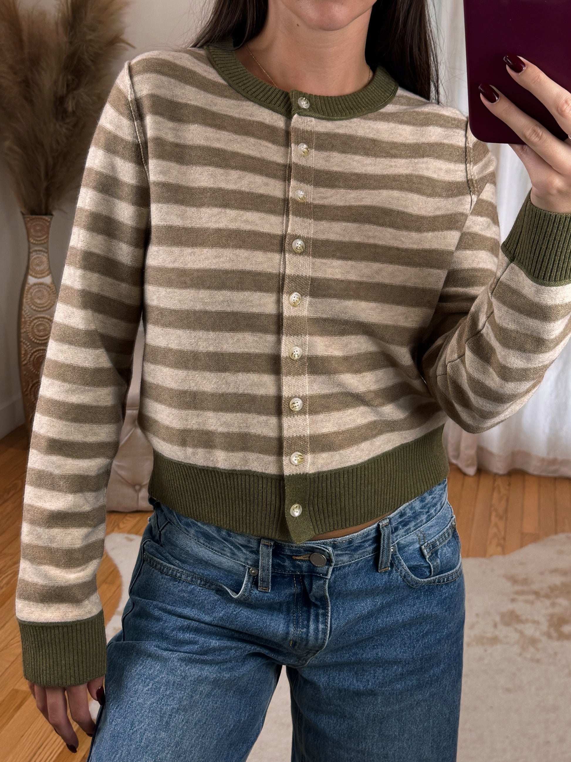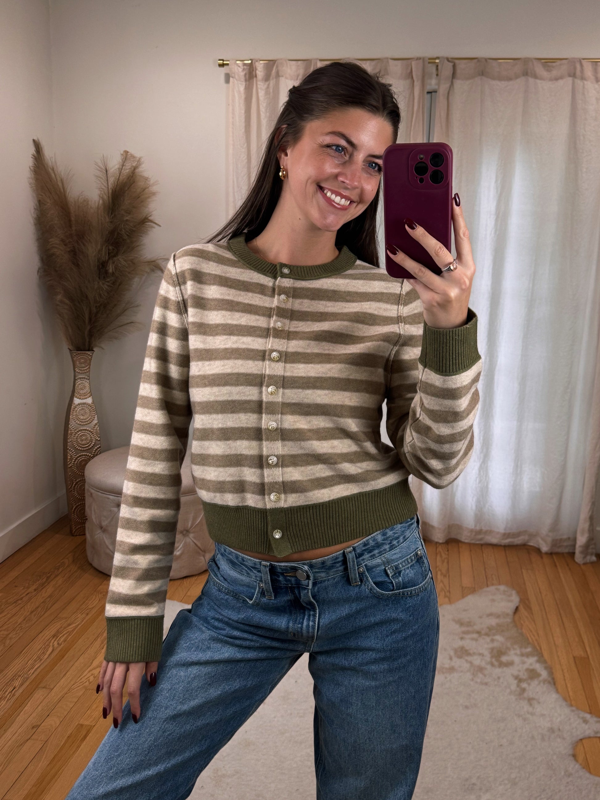 Adorable Striped Slightly Cropped Cardigan ft. Olive Green Trimming.