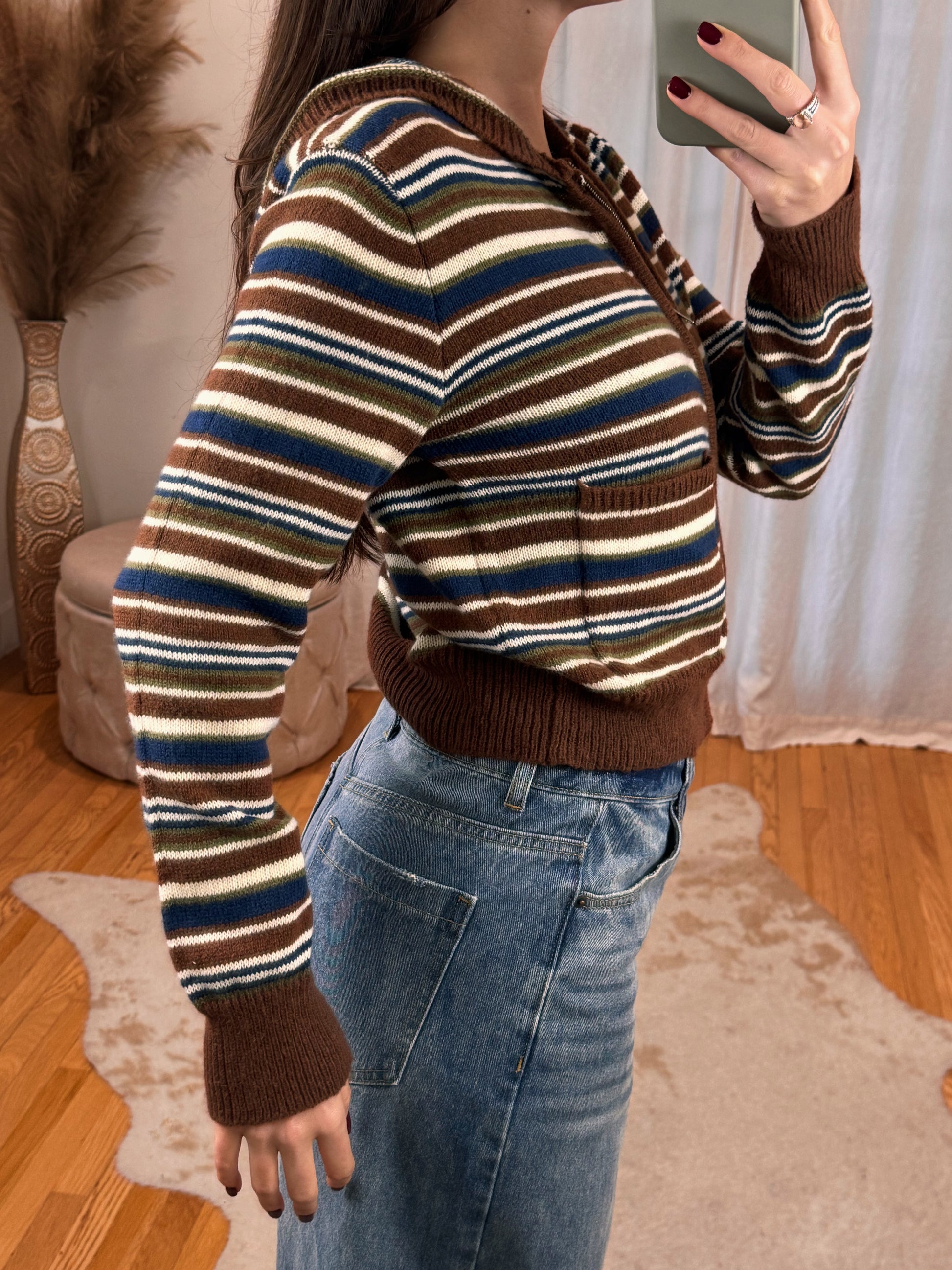 Total Maclaine vybessss! Mocha Brown Mid Length Striped Zip Up ft. Hood & Front Pockets.