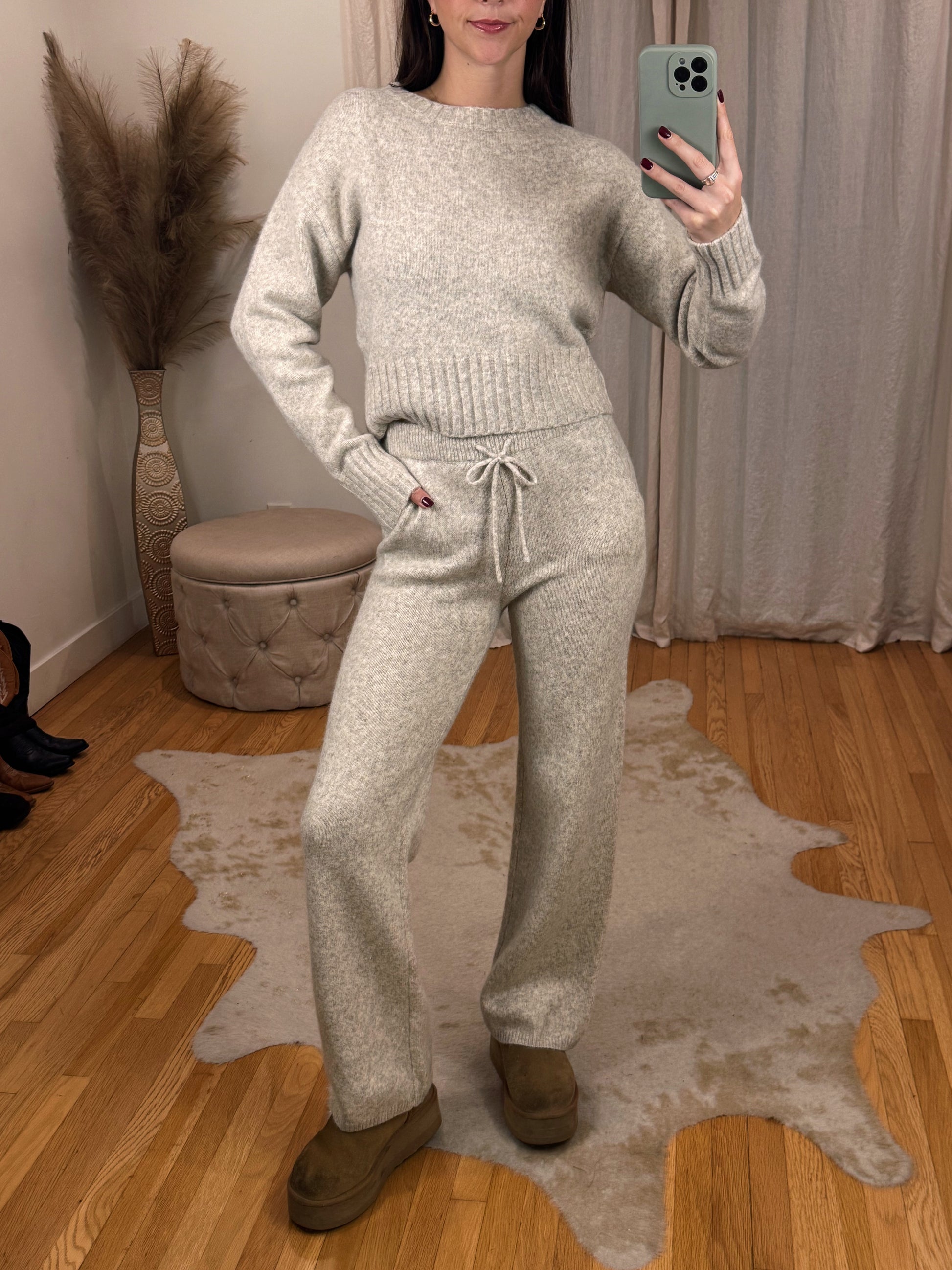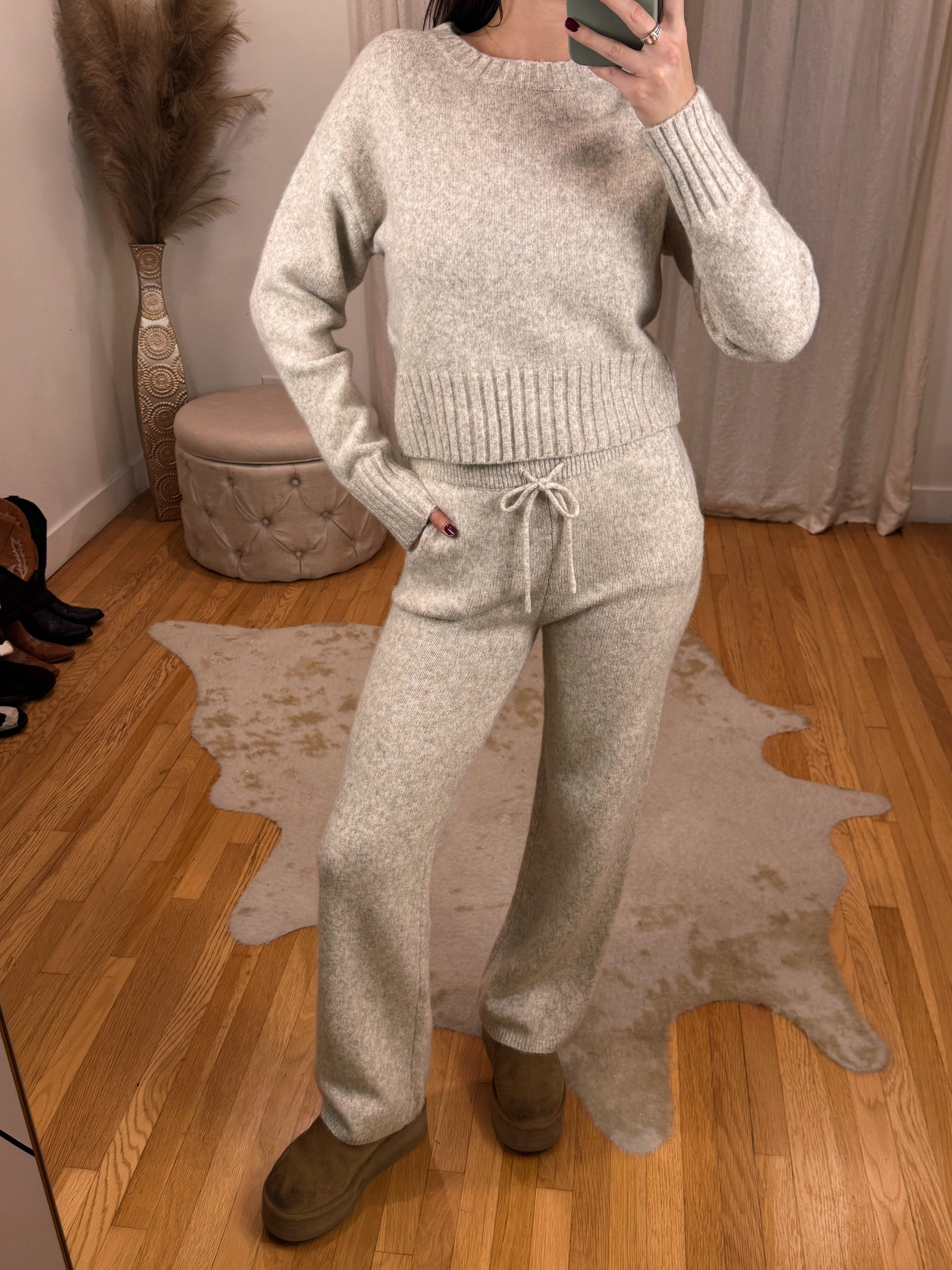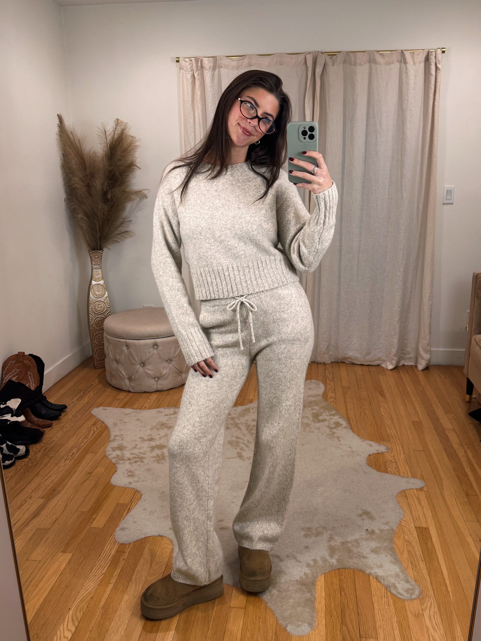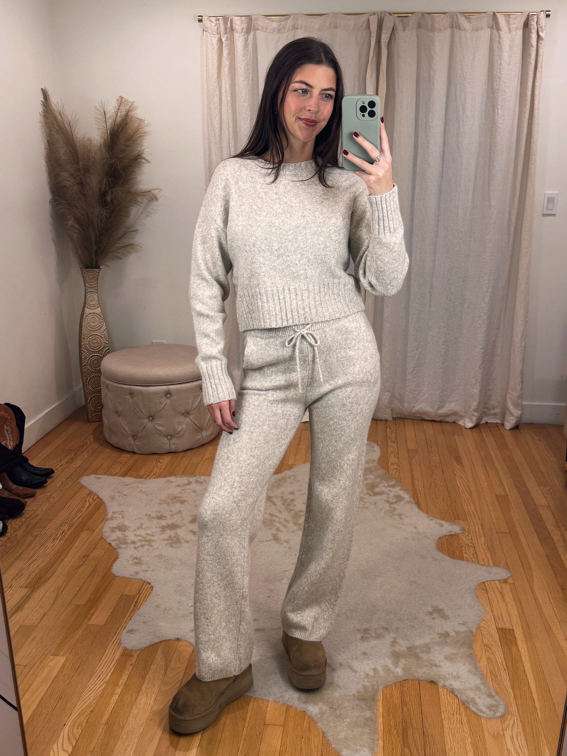 Quite literally the coziest yet flattering Oat Colored two piece knit pants set. High Waisted Wide Leg Bottoms ft. Drawstring waist and ultra stretchy form fitting fit. Slightly Cropped Matching Crewneck Sweater!