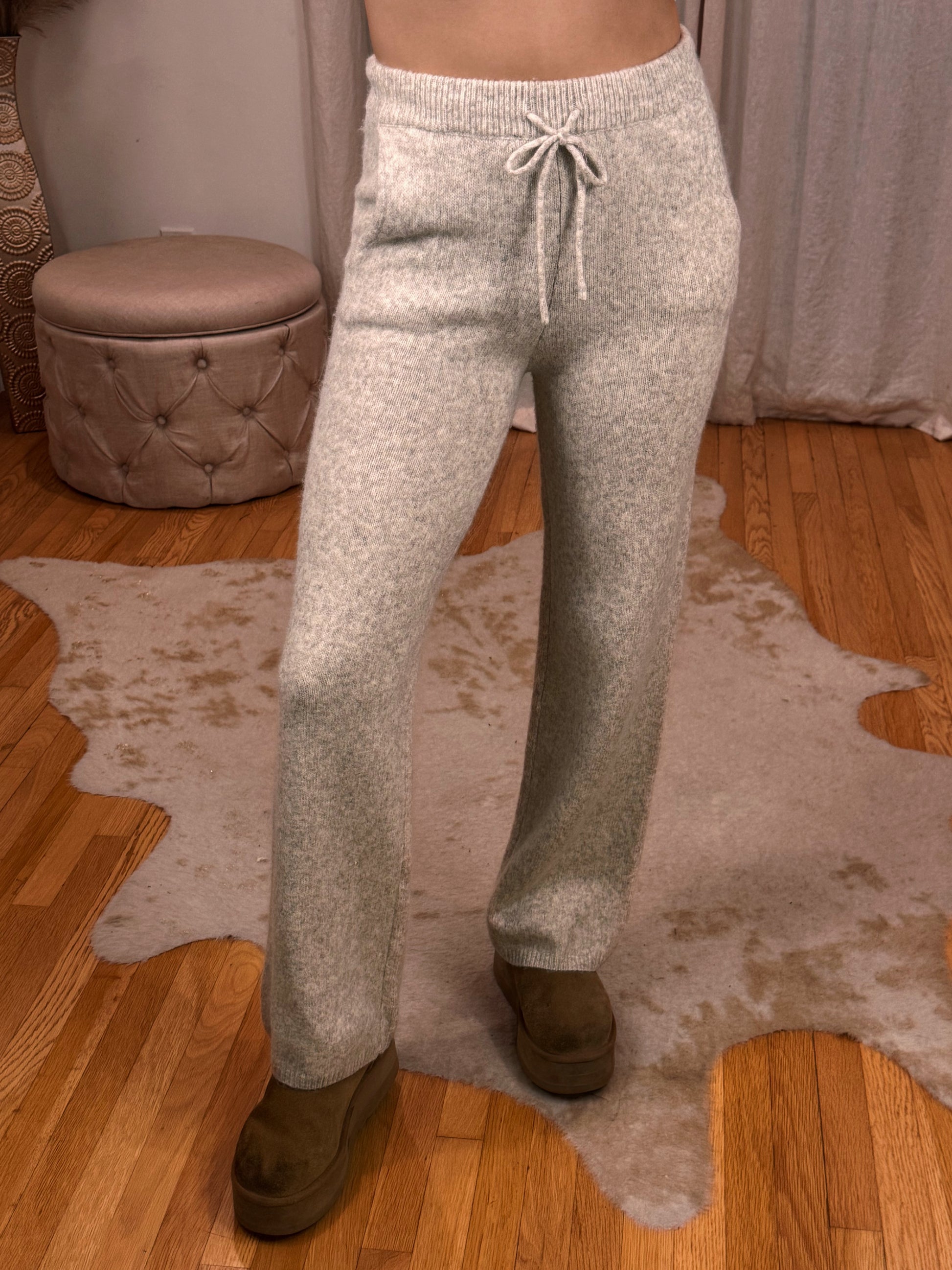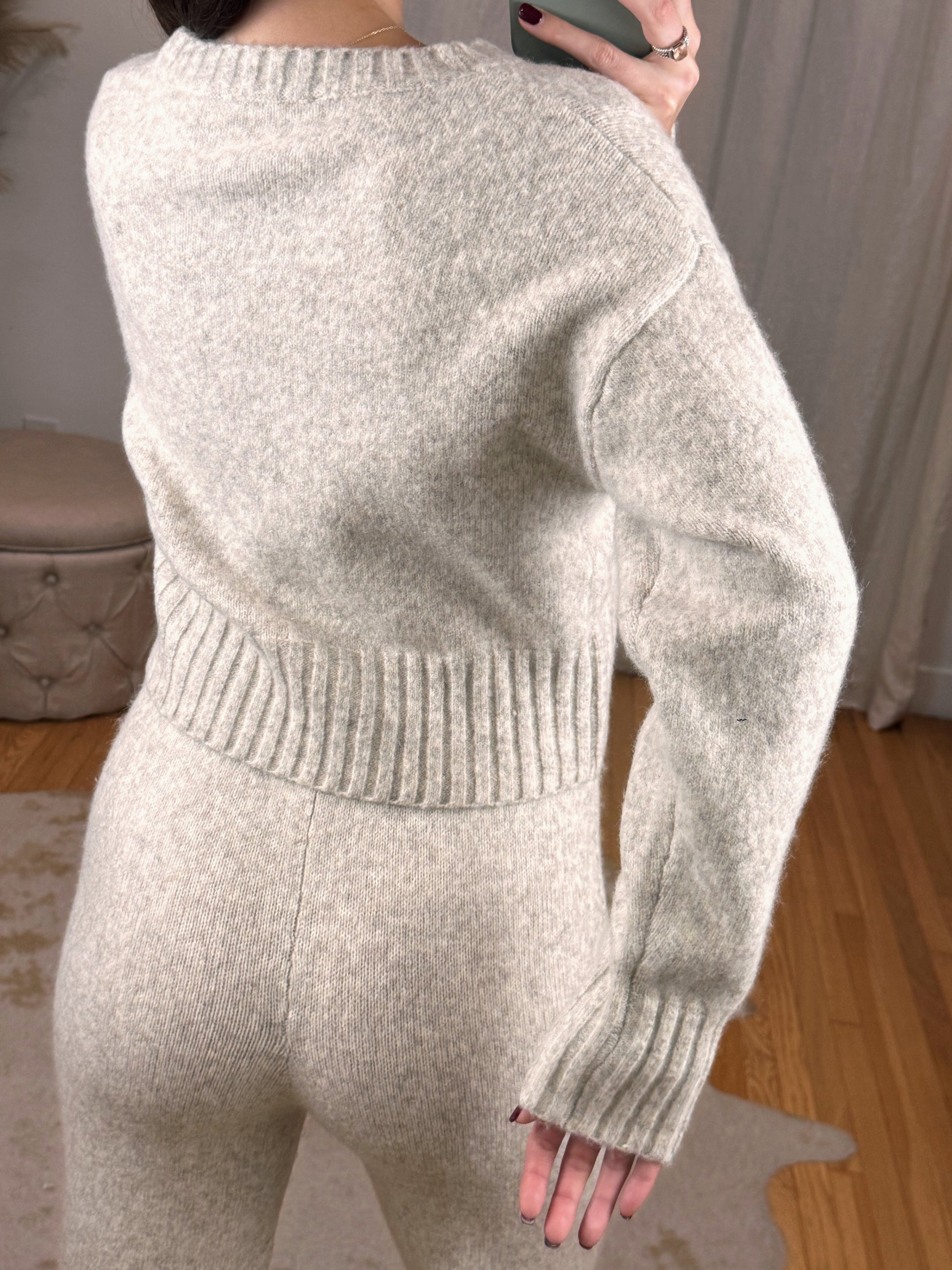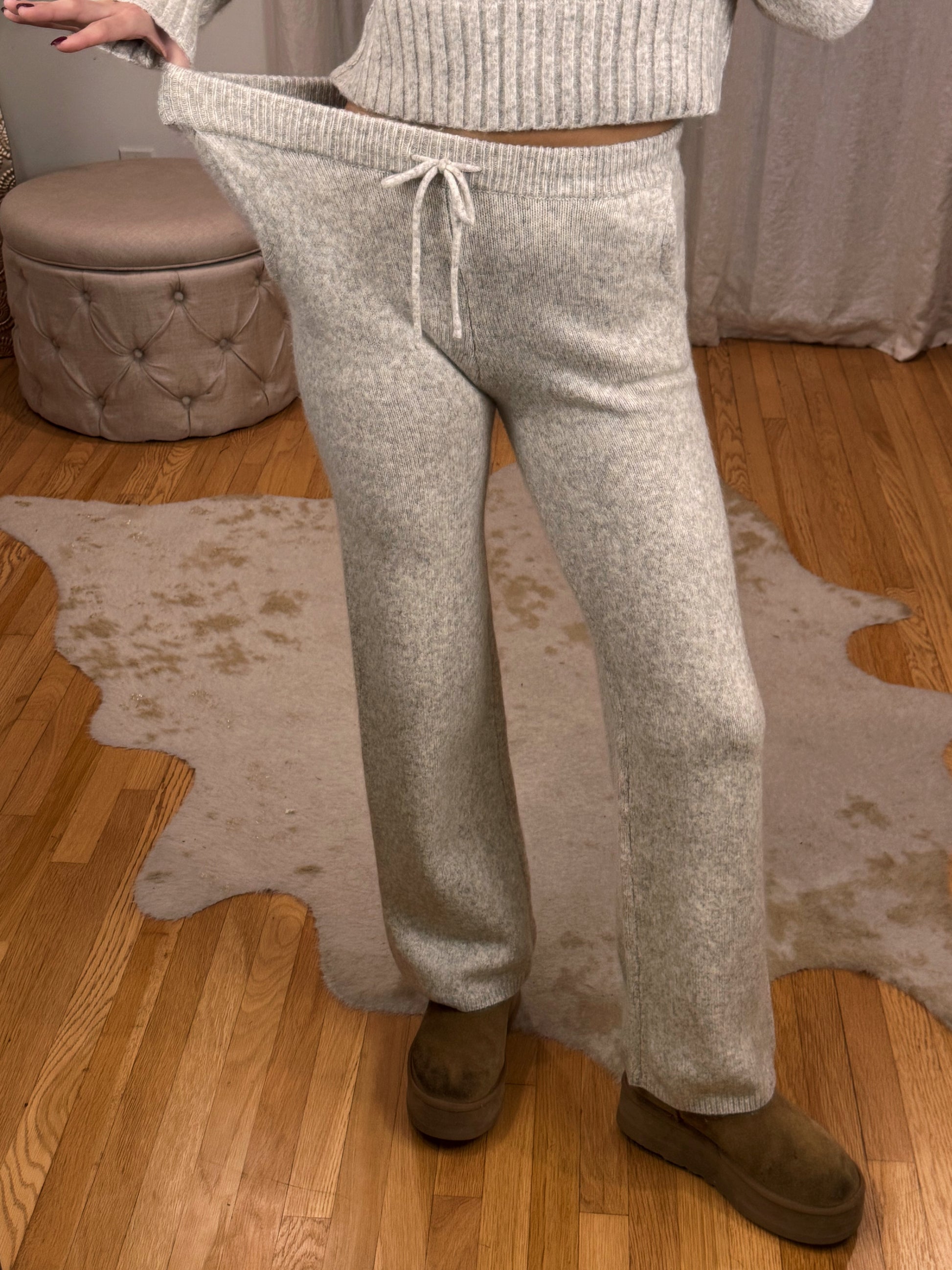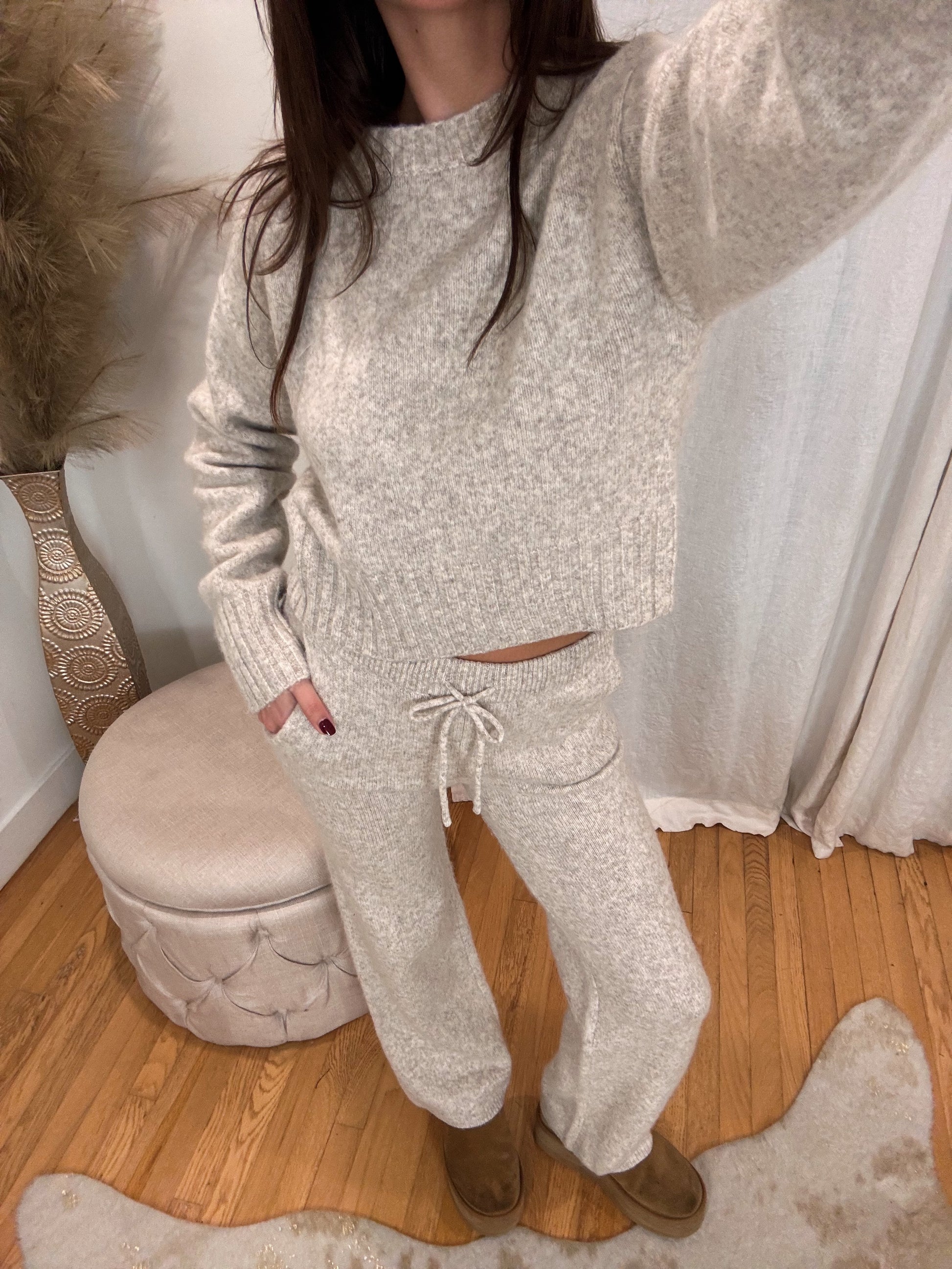Quite literally the coziest yet flattering Oat Colored two piece knit pants set. High Waisted Wide Leg Bottoms ft. Drawstring waist and ultra stretchy form fitting fit. Slightly Cropped Matching Crewneck Sweater!