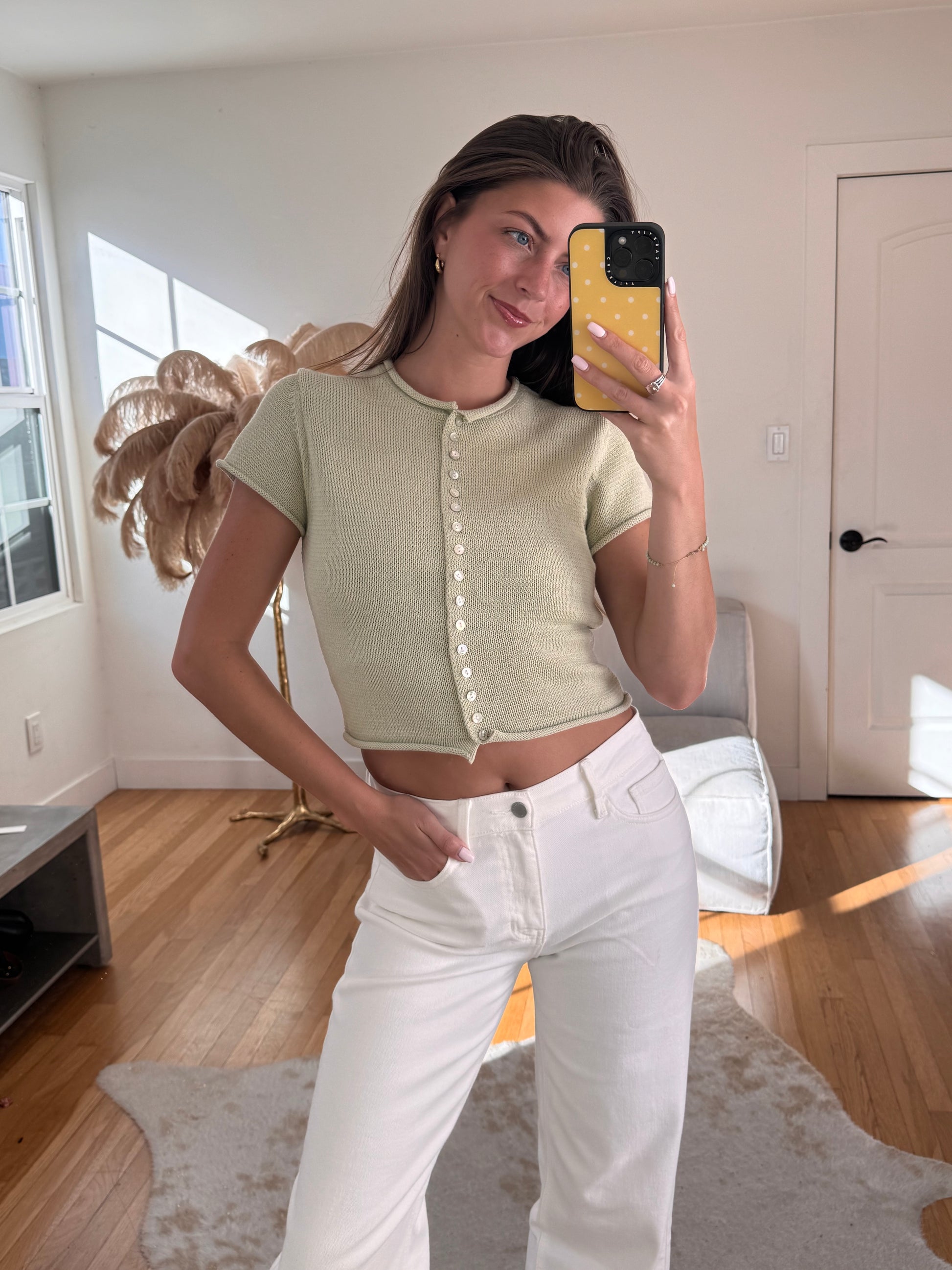 Adorable little short sleeve knit top ft. button up & rolled hem. Restocking in 1 month!!