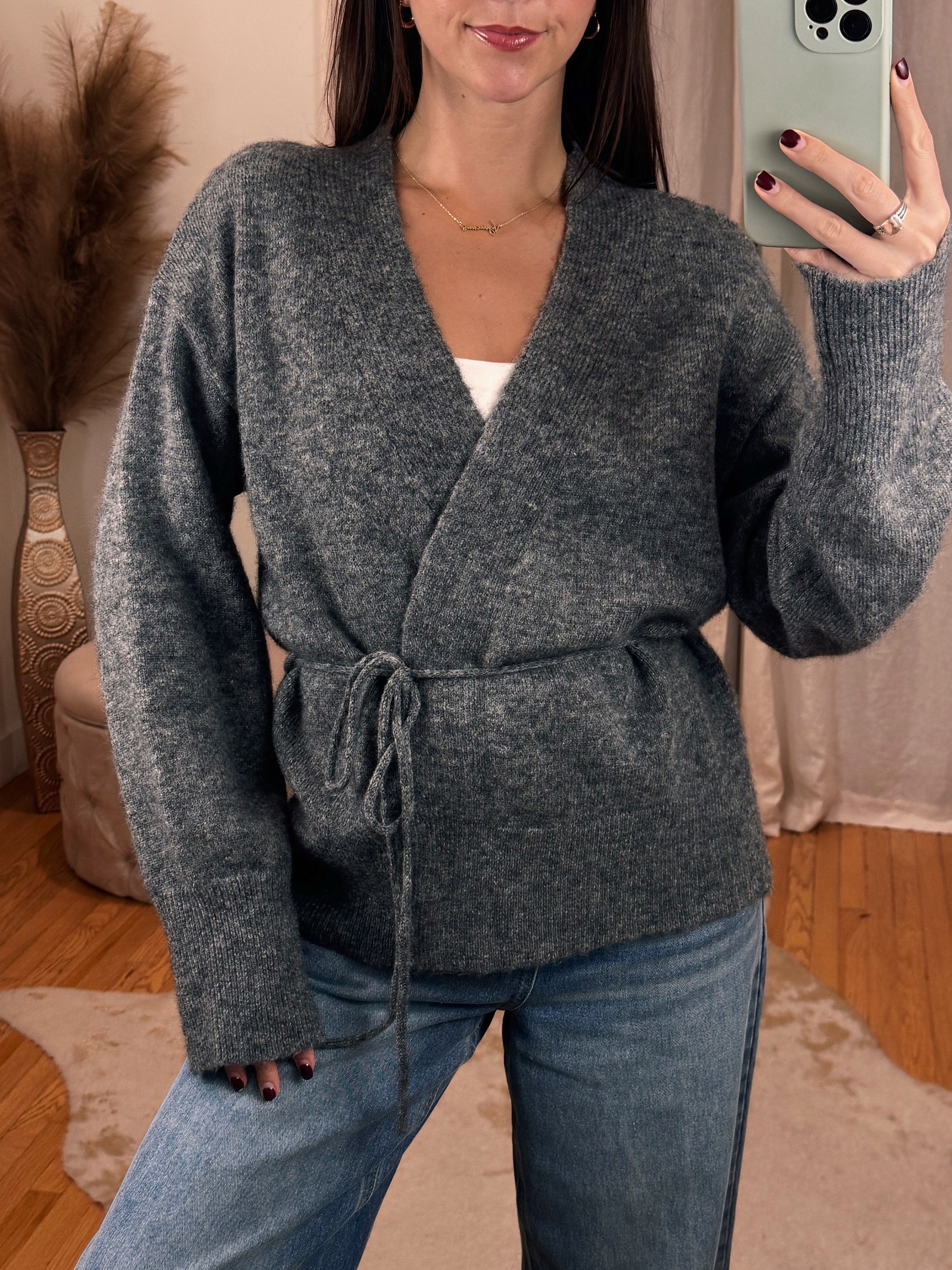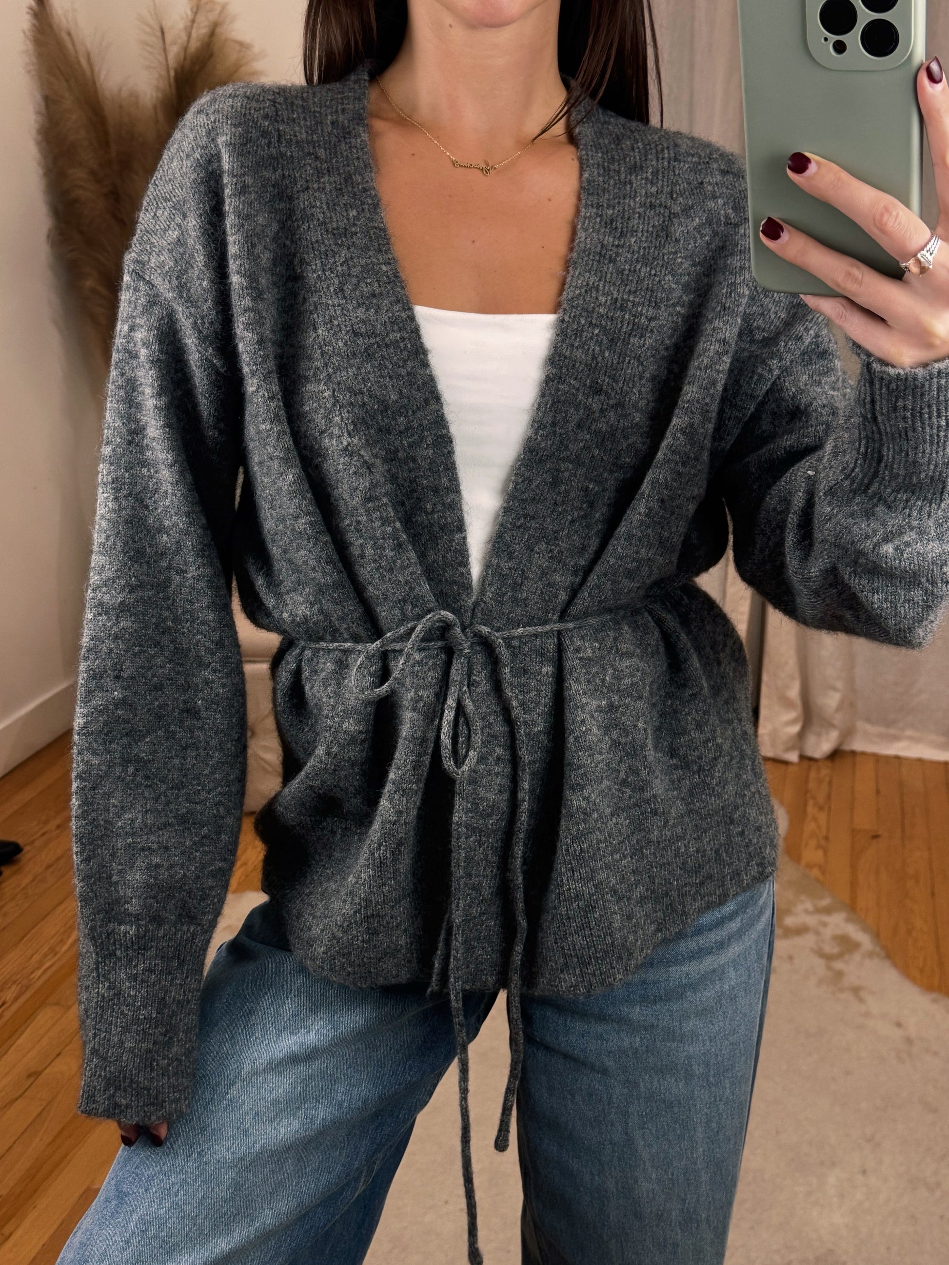 Thick Dark Charcoal Grey Open Faced Knit Cardigan ft. Waist Tie! See photos for 3 ways to wear! Adorable with leggings or jeans. Perfect for any age!