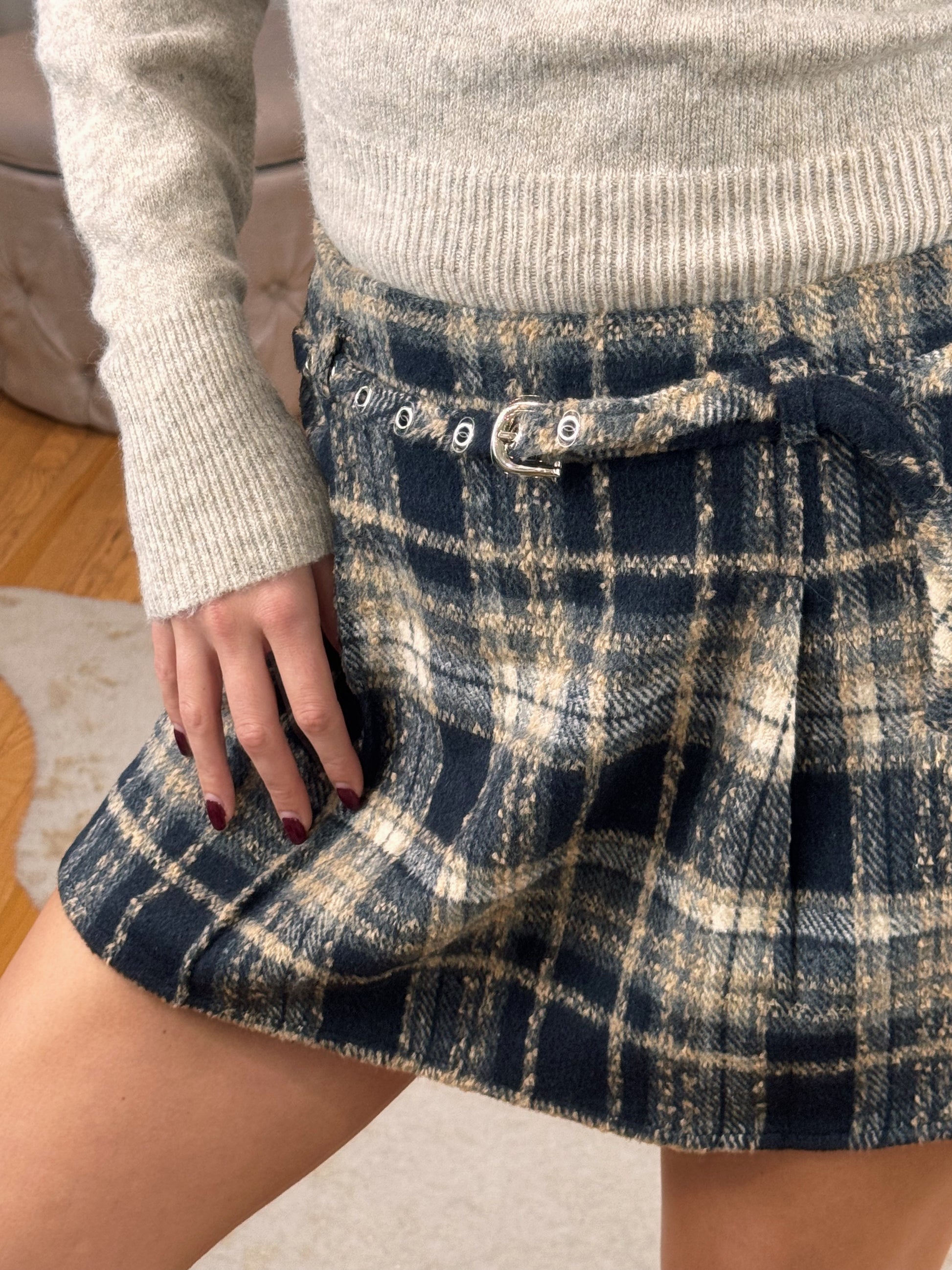 The Plaid skirt you've been searching for! Totally giving Gossip Girl Vybes! High Waisted Pleated Navy & Cream Plaid Skirt ft. Detachable Belt w/ Belt Loops and side zipper + clasp.
