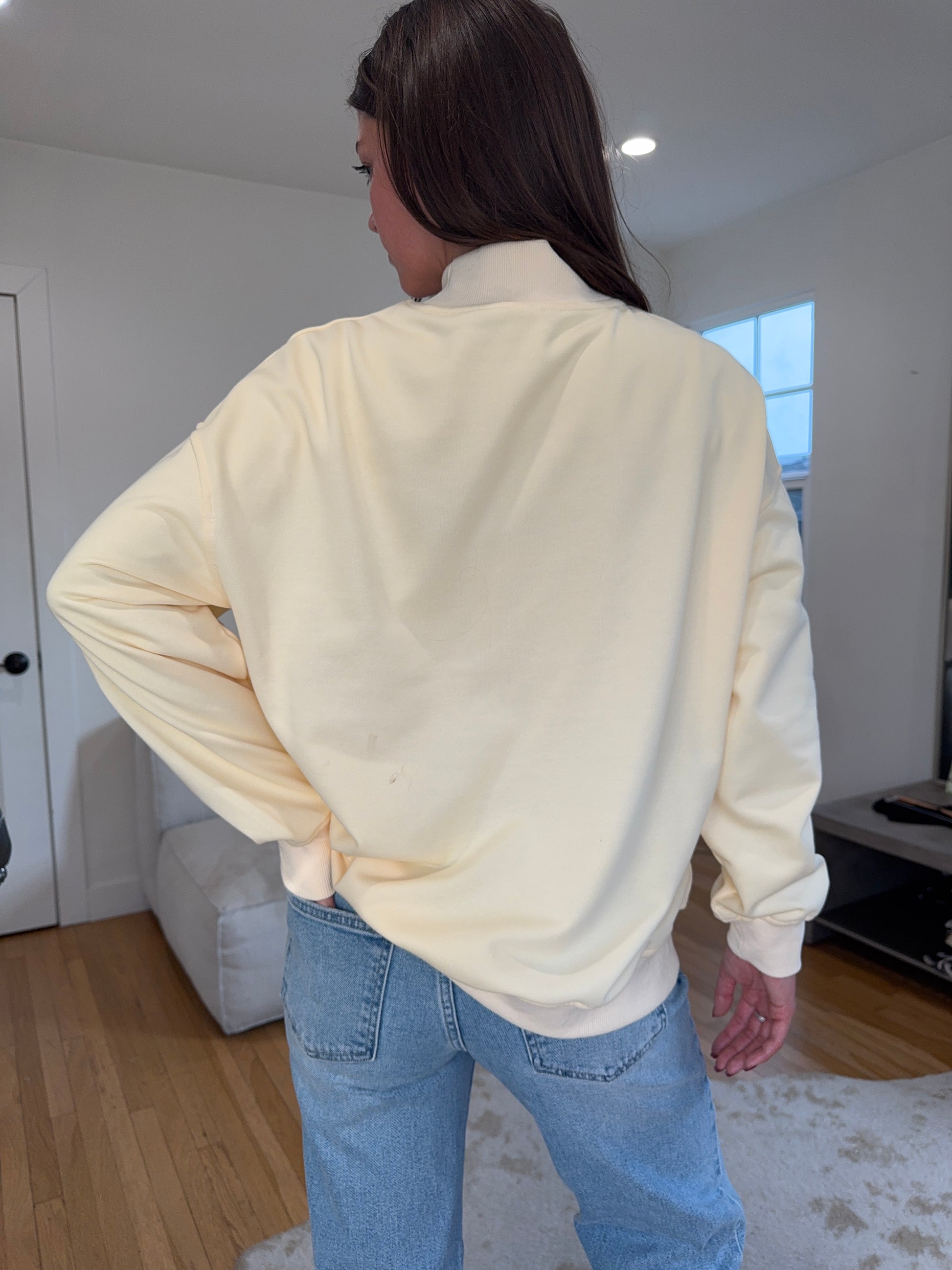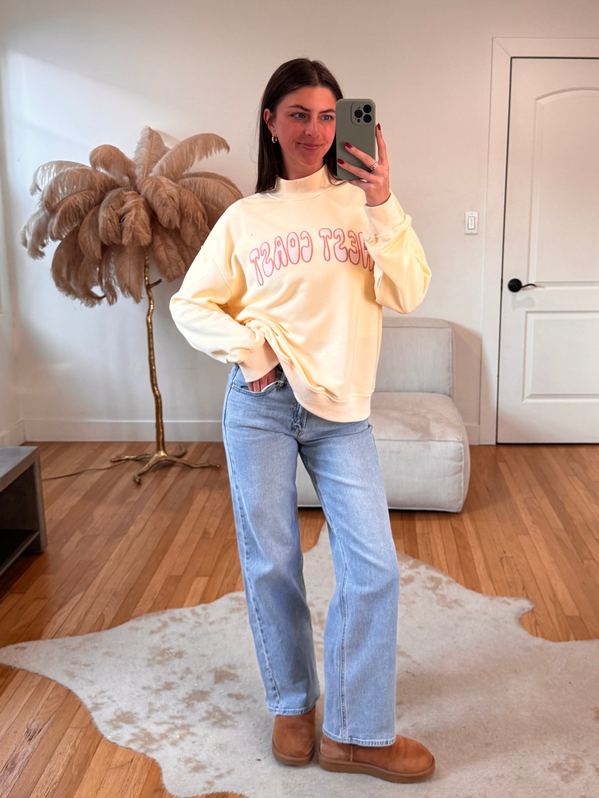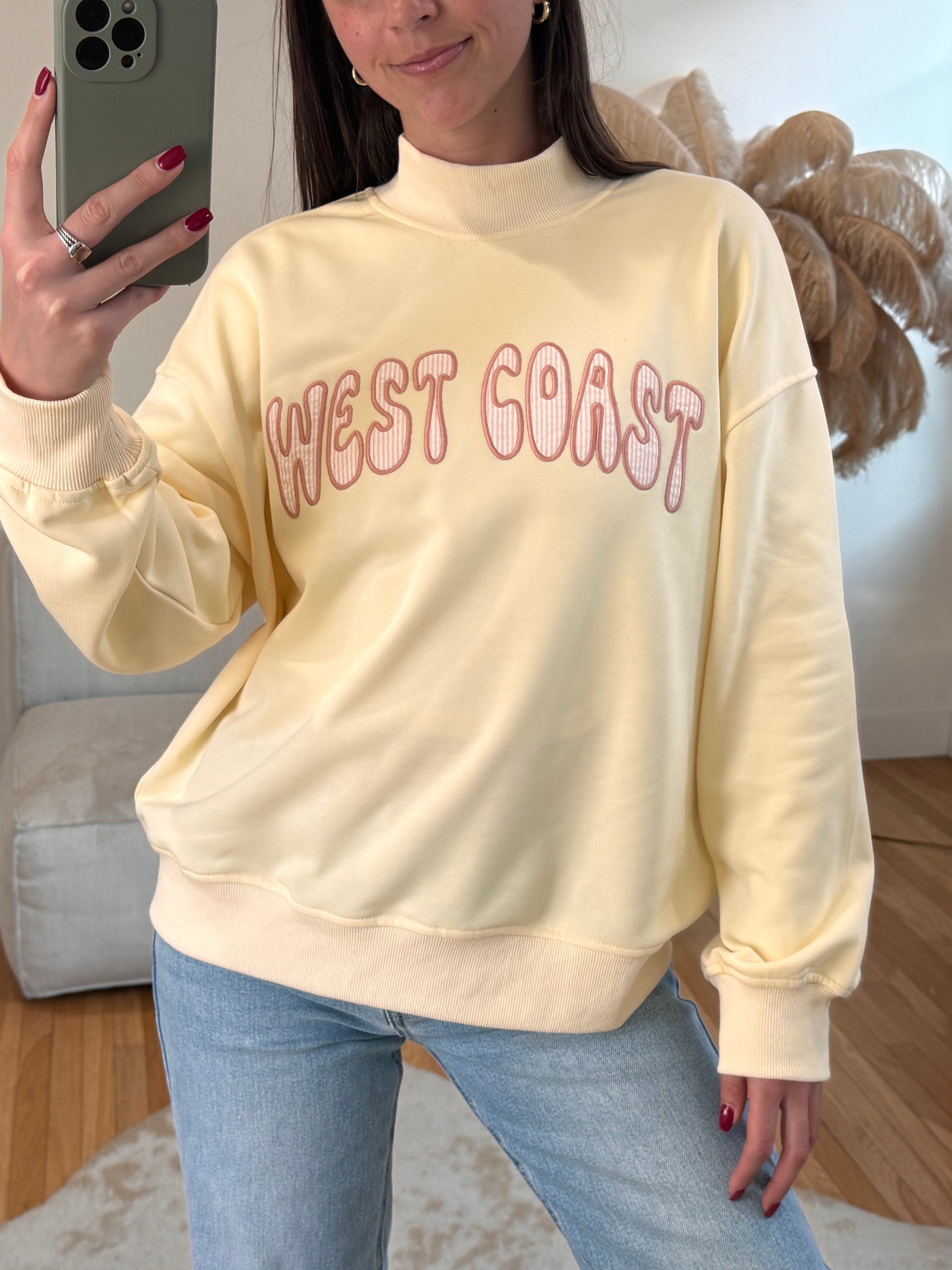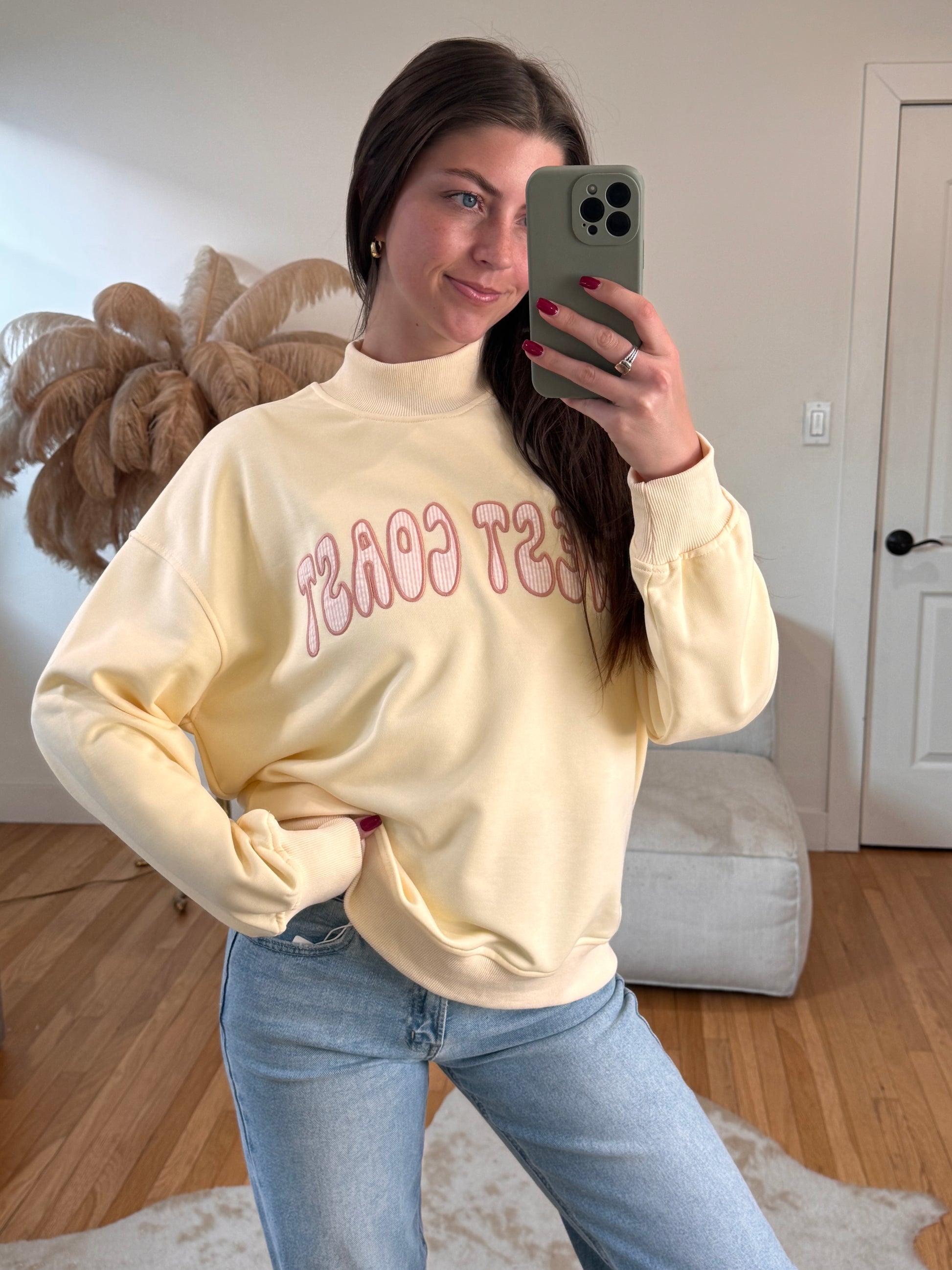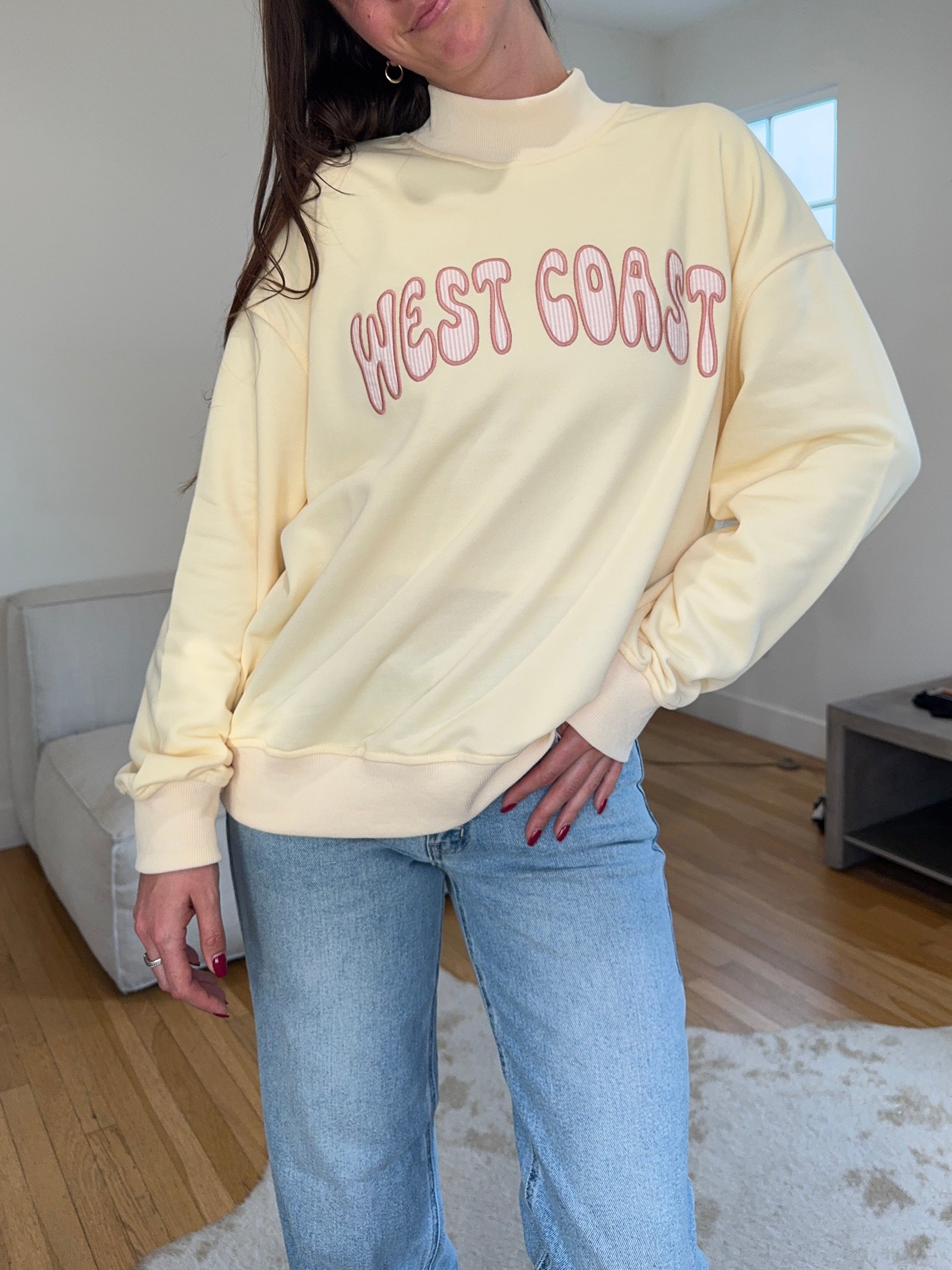 The most adorable pale butter yellow mock neck! West Coast in a fun bubbly font ft. seersucker salmon stripes.